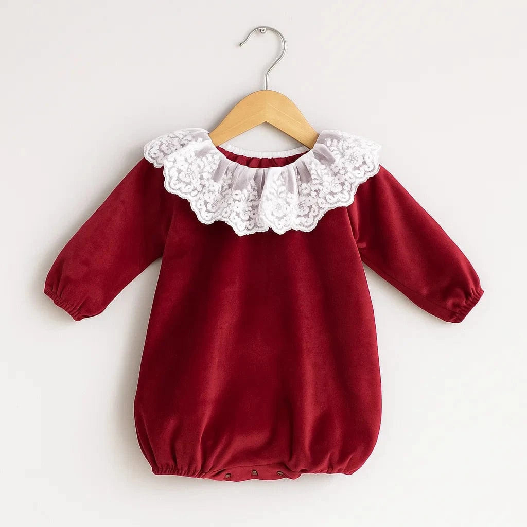 Pagliaccetto in velluto foderato bordeaux con elegante colletto in pizzo, perfetto per le feste natalizie. Un capo raffinato e ricercato, ideale per celebrare il primo Natale con stile e dolcezza.