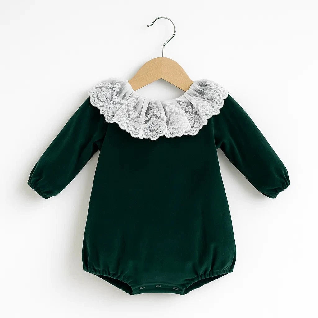 Pagliaccetto in velluto foderato verde muschio con elegante colletto in pizzo, perfetto per le feste natalizie. Un capo raffinato e ricercato, ideale per celebrare il primo Natale con stile e dolcezza.