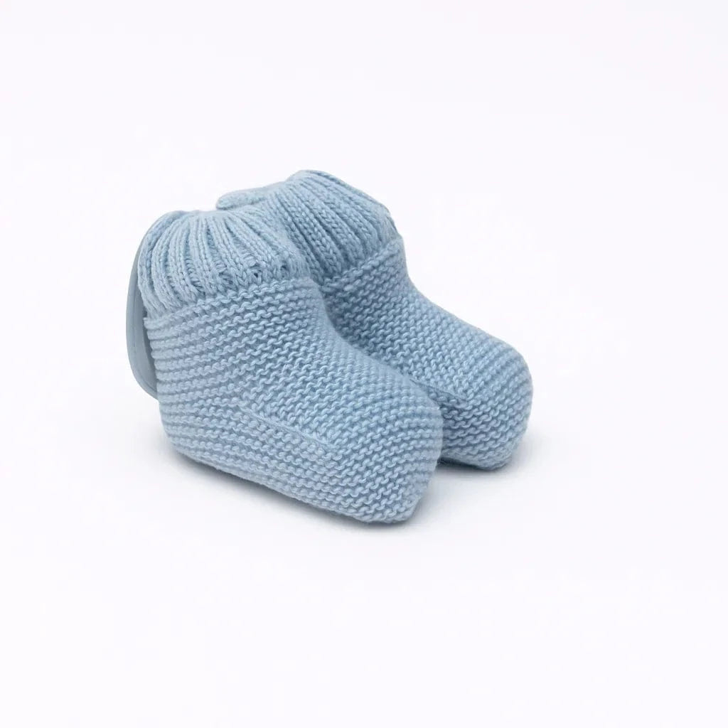 Babbucce in lana per neonato, morbide e avvolgenti, ideali per tenere i piedini al caldo con delicatezza.