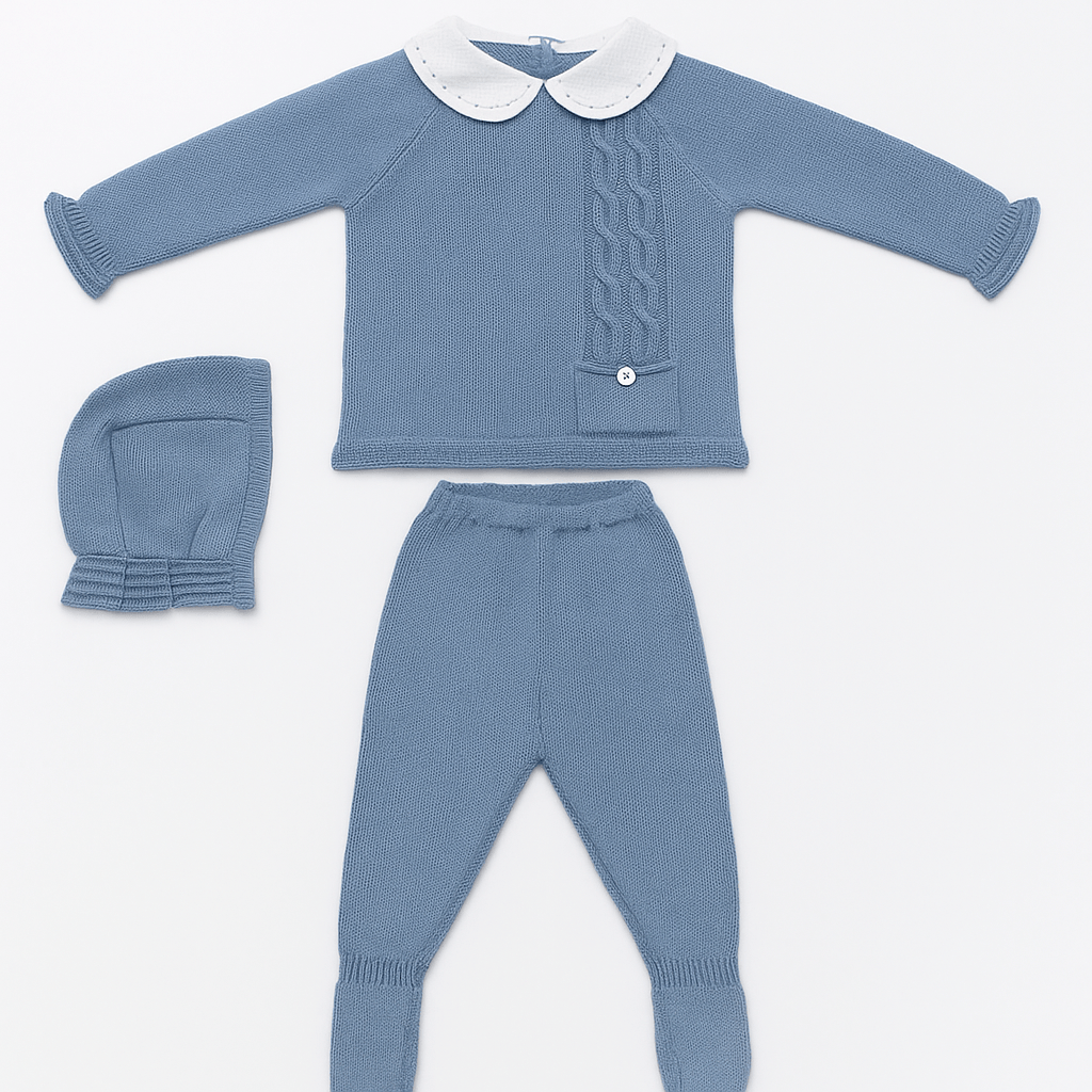 Completo neonato in maglia composto da tre pezzi, pensato per un’eleganza pratica e confortevole. La maglia presenta un delicato punto lavorato sul davanti e un colletto bianco ricamato che aggiunge un tocco raffinato. I polsini con bordo ondulato valorizzano ulteriormente lo stile. I pantaloni in maglia con piedini assicurano calore e vestibilità avvolgente, mentre il cappellino coordinato completa l’outfit con un dettaglio classico e impeccabile. Perfetto per le giornate più fresche e per le occasioni speciali.