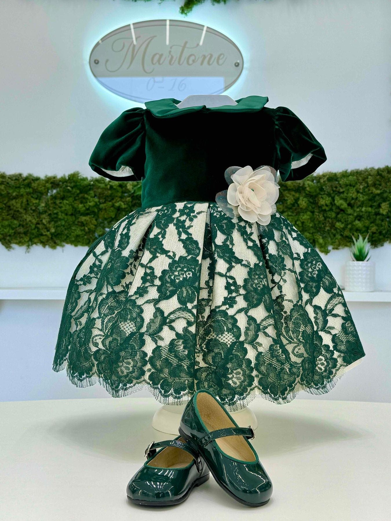 Abito battesimale mezza manica con corpetto di velluto e gonna di merletto con fiore in vita