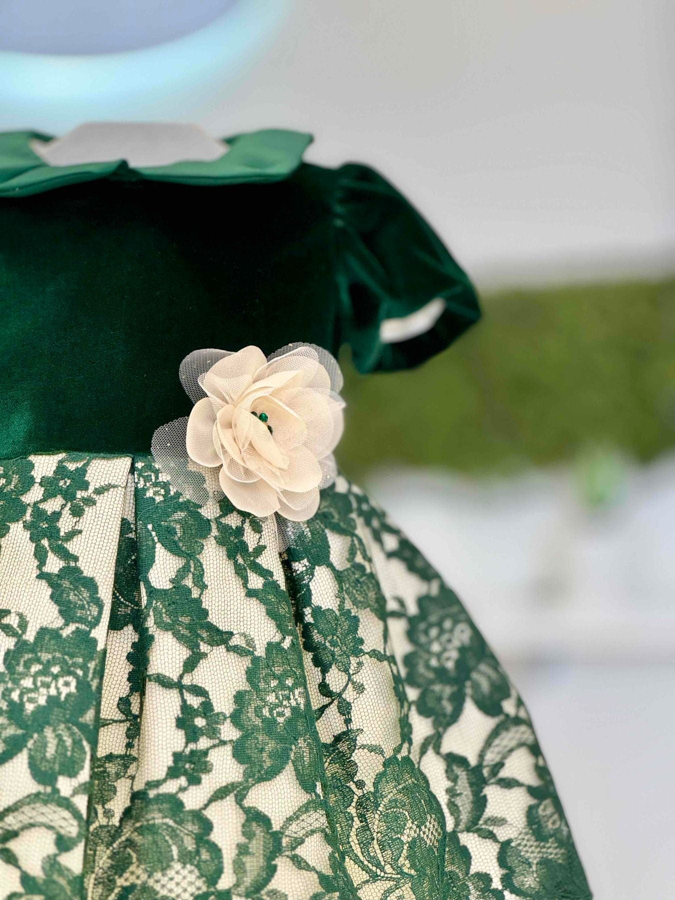 Abito mezza manica con corpetto di velluto e gonna di merletto con fiore in vita