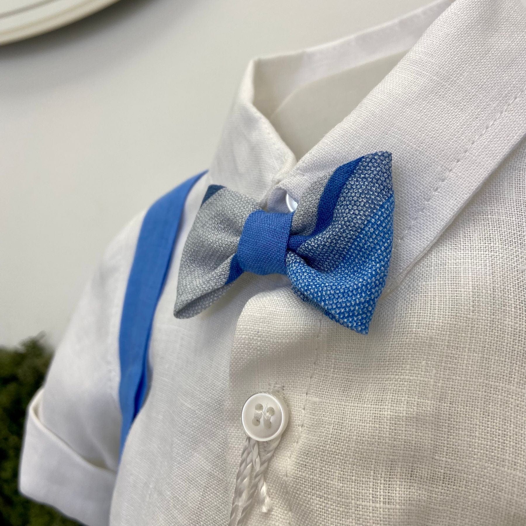Completo con salopette,con camicia bianca,papillon e pantalone a righe .