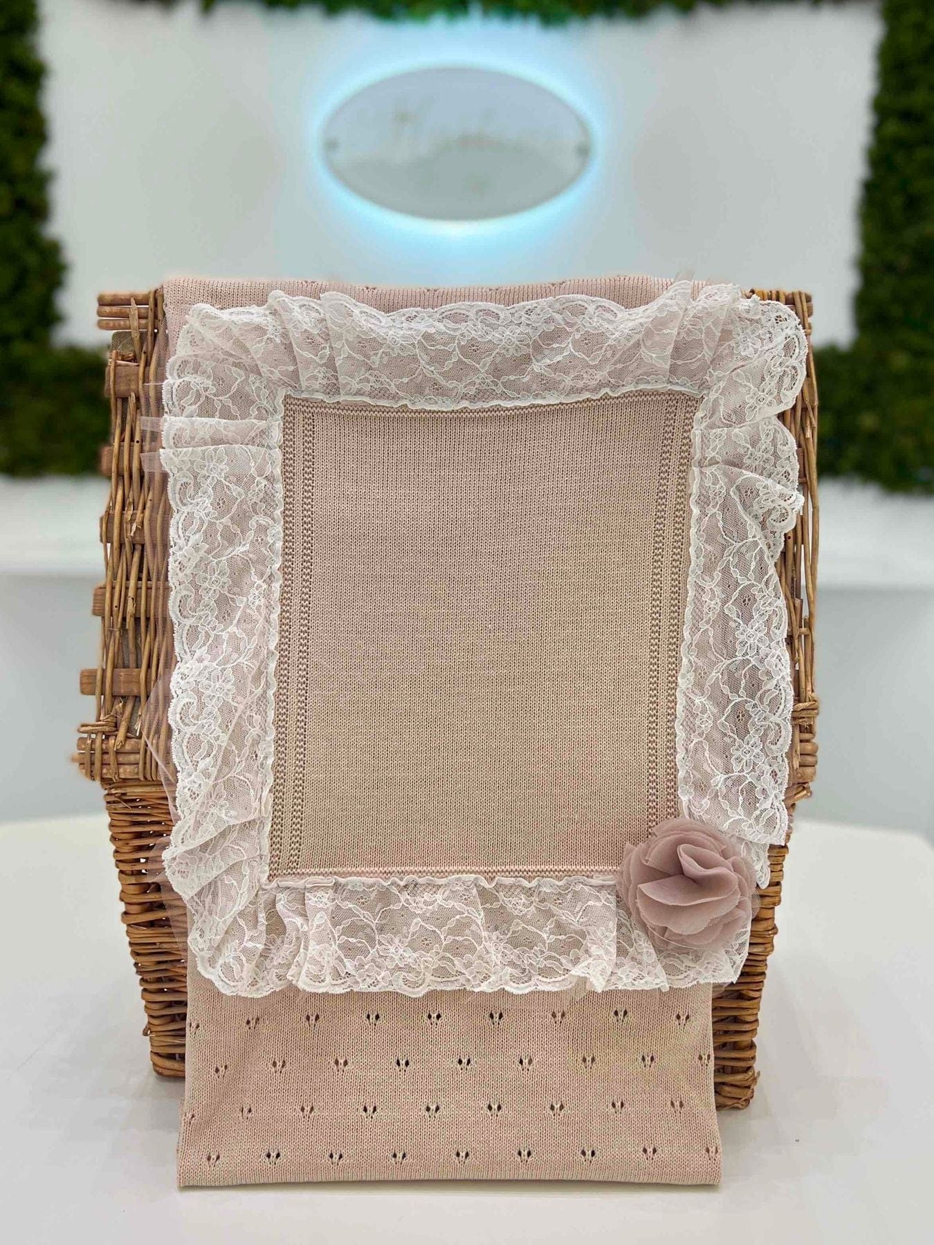 Coperta neonata in filo di cotone traforato con dettaglio in pizzo e tulle ricamato.