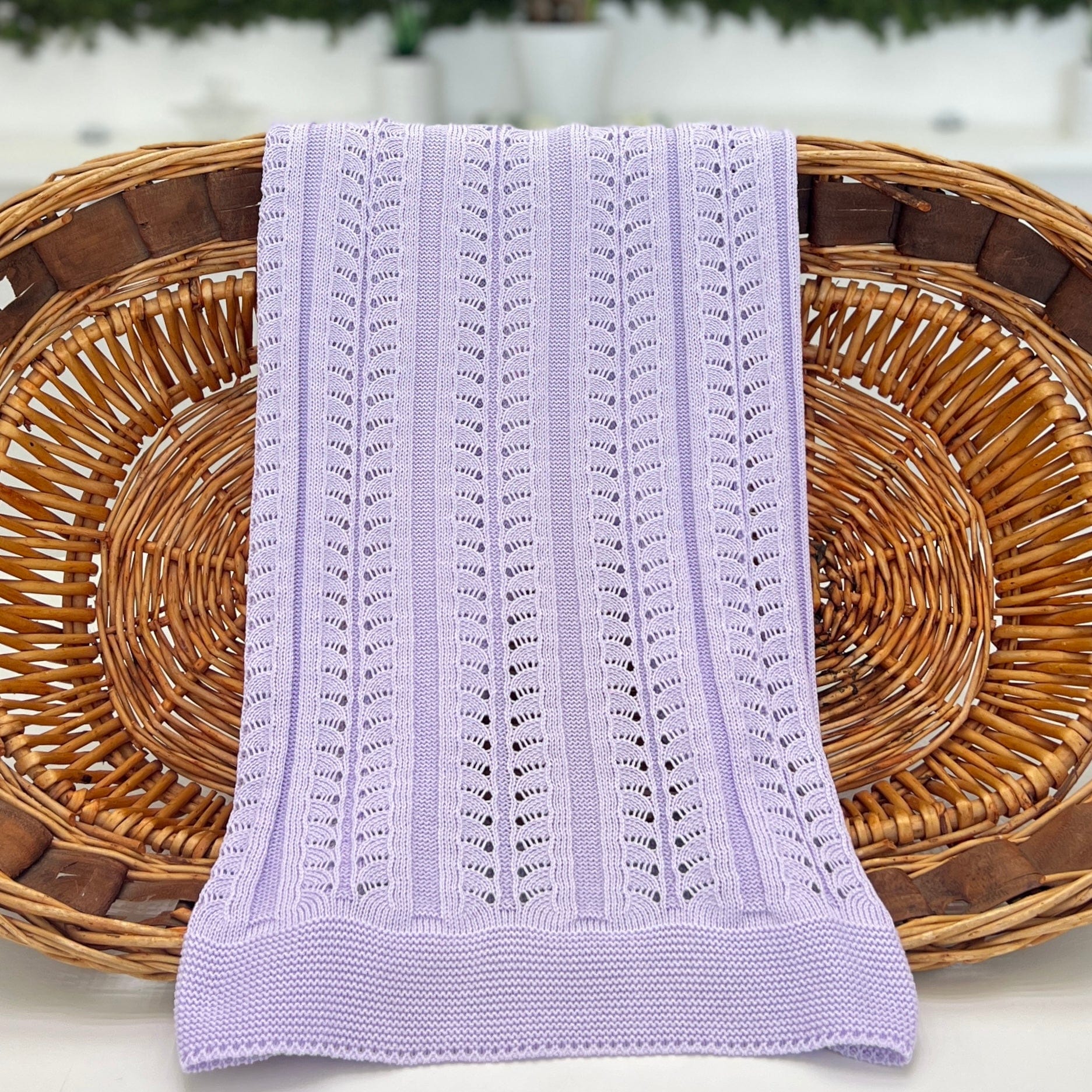 Copertina in filo di cotone color glicine, impreziosita da una delicata lavorazione traforata che dona leggerezza e raffinatezza. Morbida al tatto e ideale per la pelle delicata della neonata, è perfetta per avvolgerla con dolcezza in ogni momento della giornata.