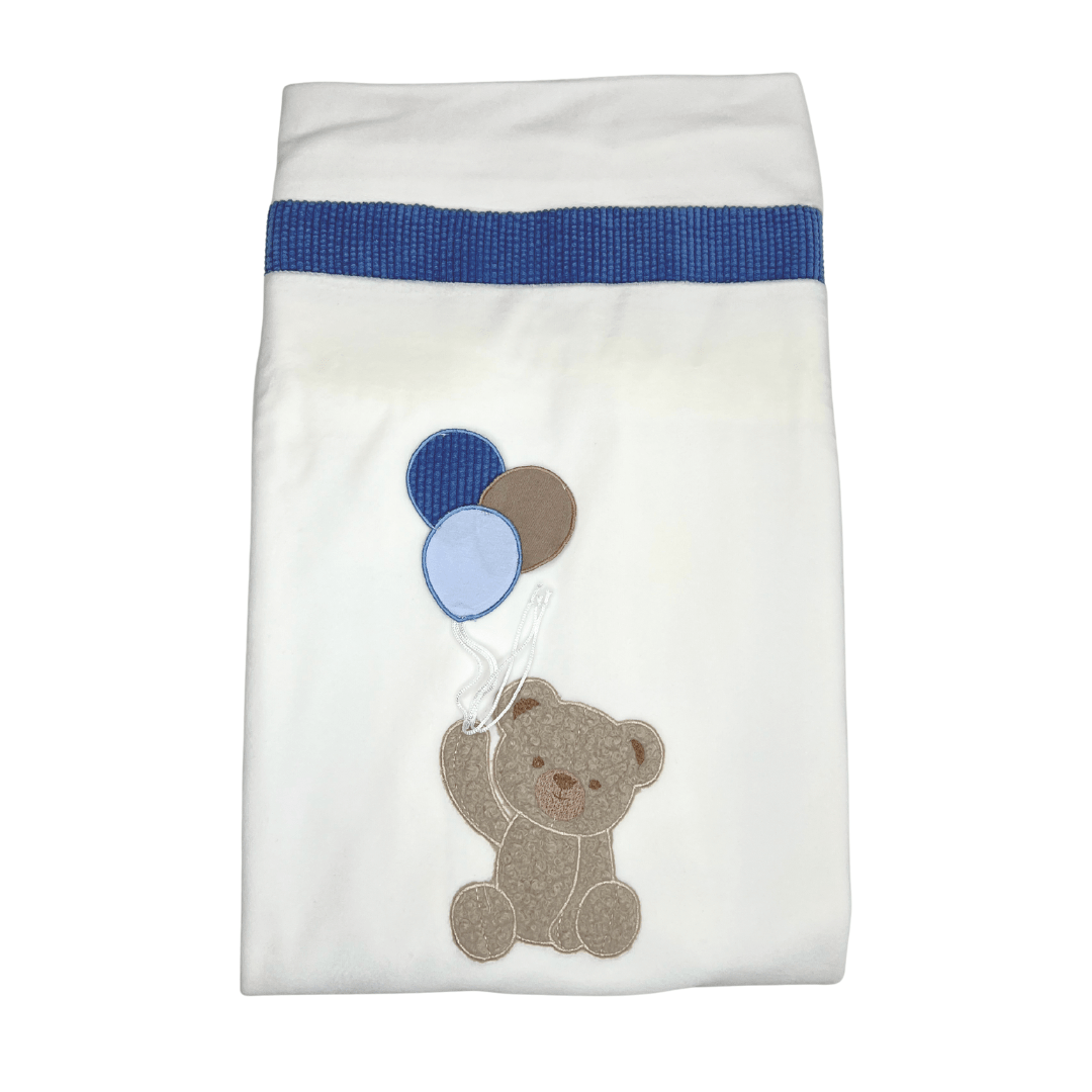 Coperta in ciniglia per neonato con bordatura a contrasto azzurra rigata e orsetto centrale applicato.