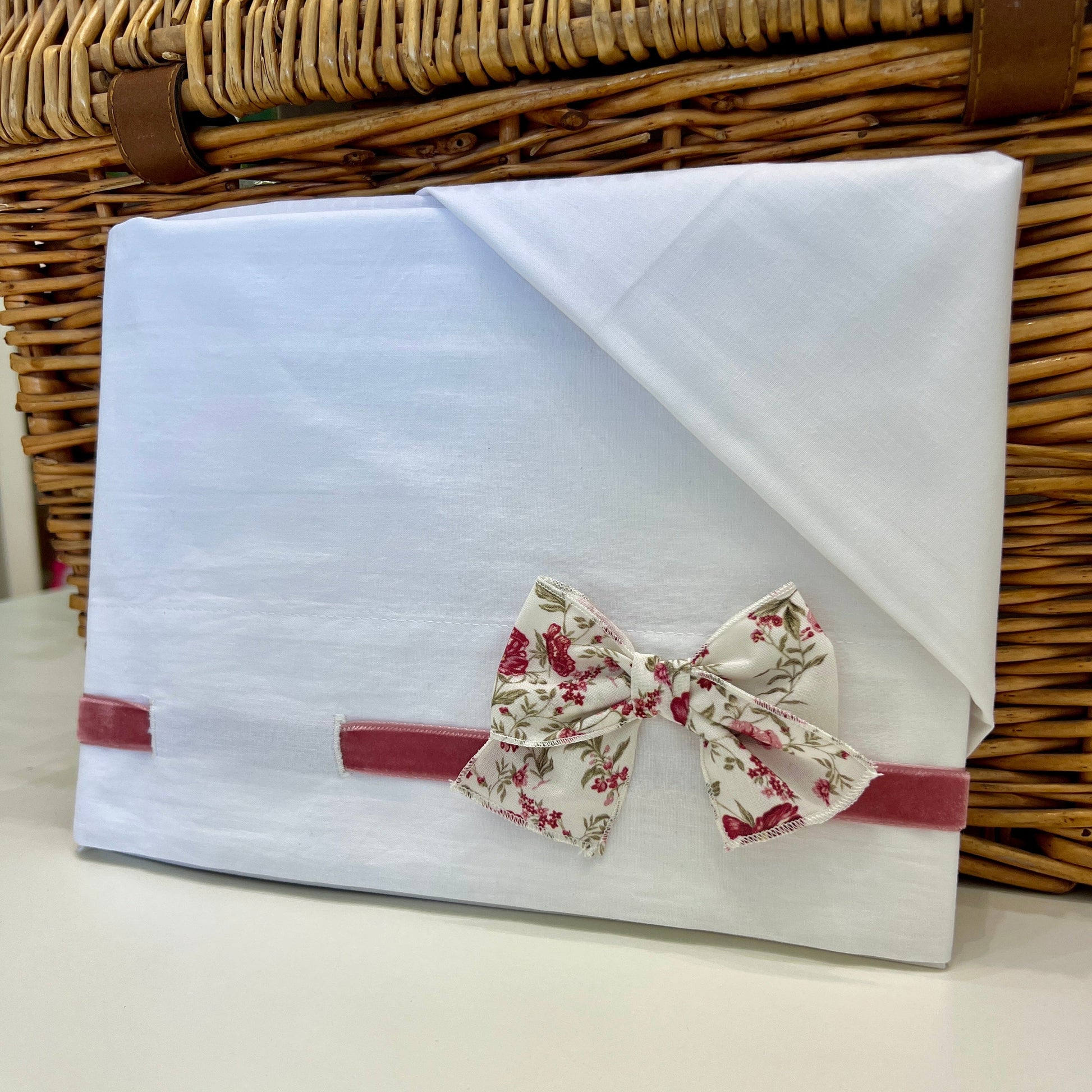 Questo elegante lenzuolino per neonata, in morbido cotone bianco, è arricchito da una passamaneria in velluto rosa e un fiocco in tessuto floreale. I dettagli in rosa antico aggiungono un tocco di dolcezza, garantendo un sonno confortevole e avvolgente. Perfetto per culle e carrozzine.