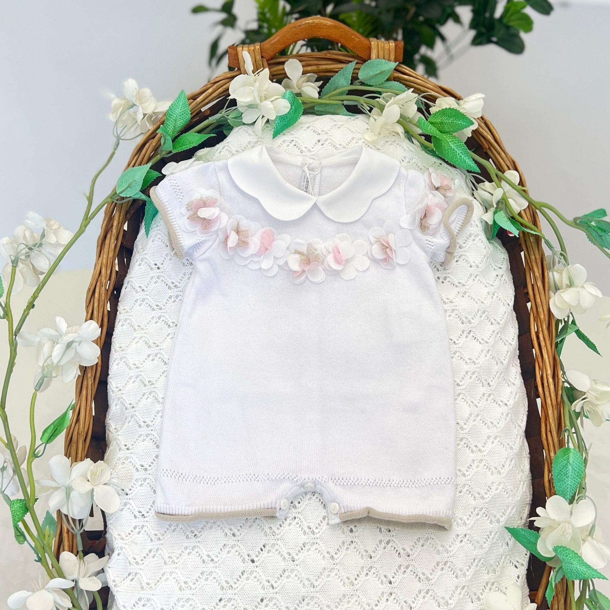 Pagliaccetto corto in filo di cotone, arricchito da ricami in punto a giorno e fiori tridimensionali, con colletto smerlato.
