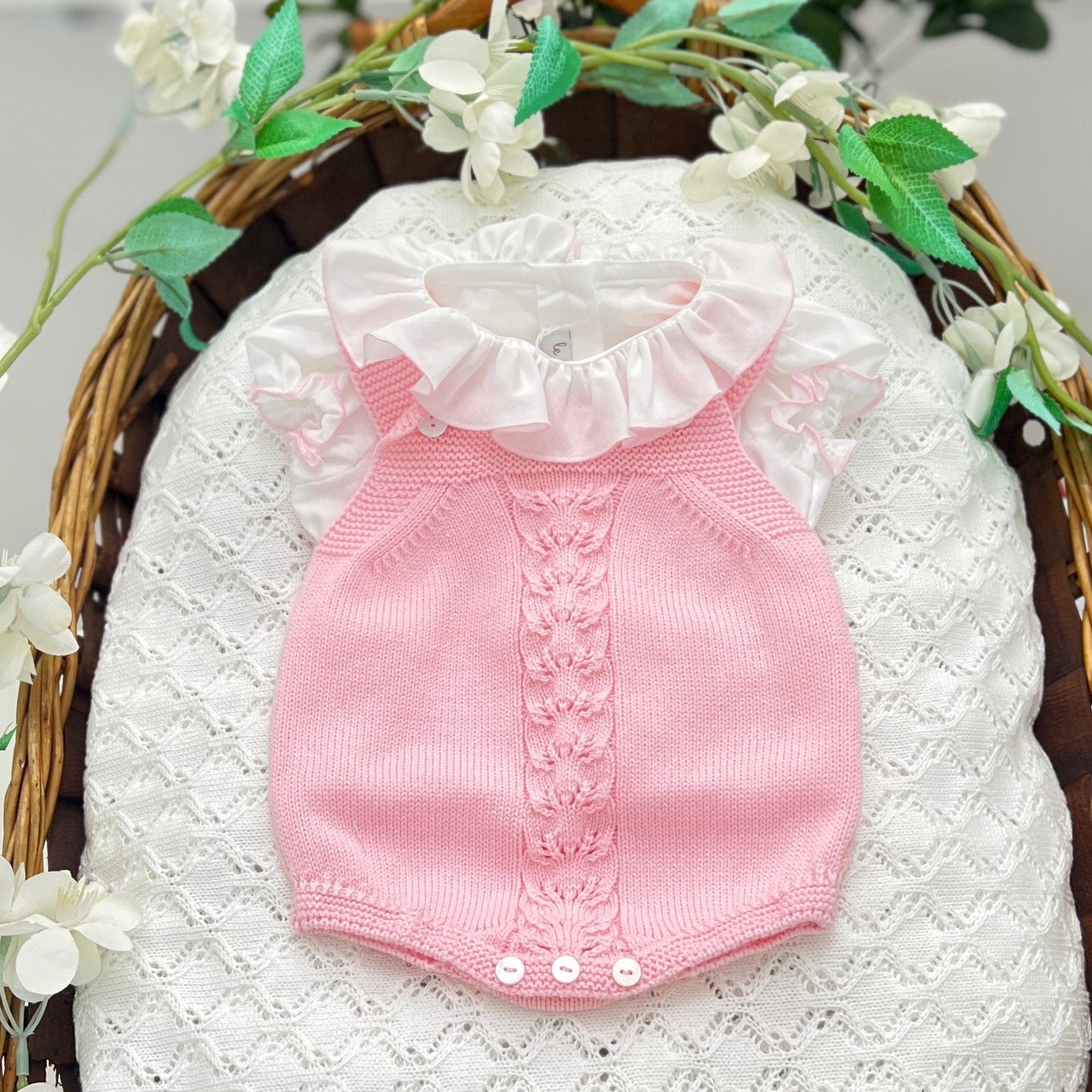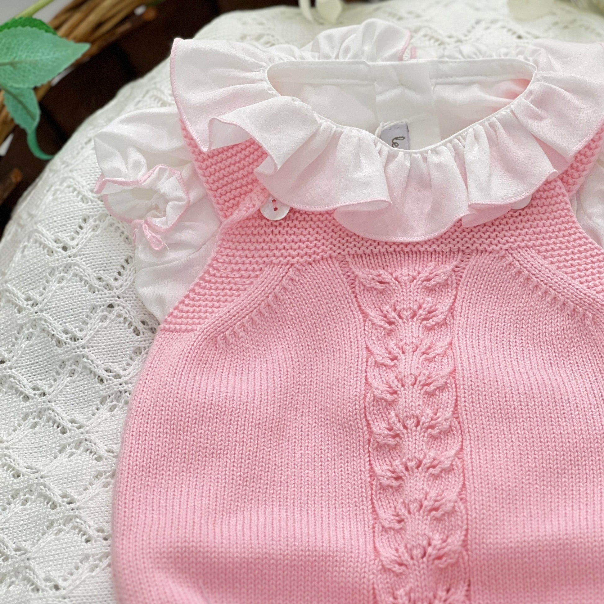 Completo per neonata composto da salopette in filo di cotone rosa e blusa con colletto arricciato e manica corta. Un abbinamento dolce e raffinato, ideale per le giornate più speciali.