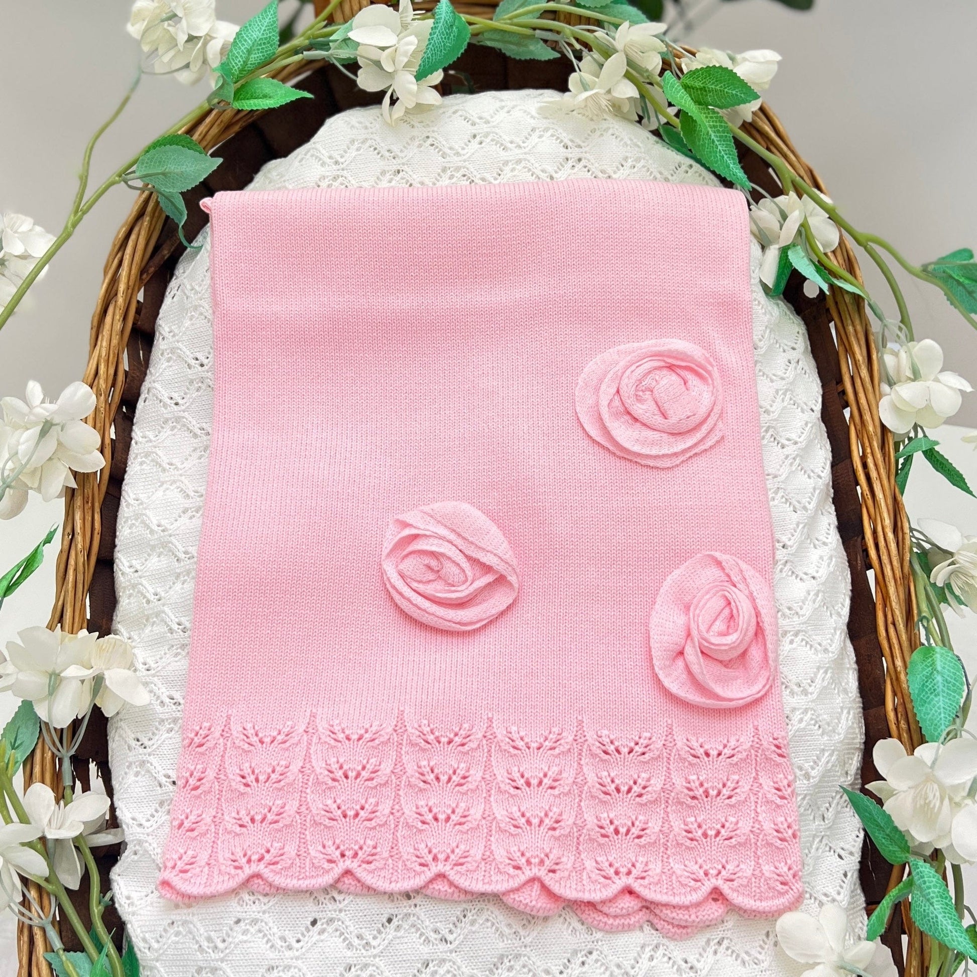 Copertina per neonata in filo di puro cotone, lavorata all'uncinetto con bordi smerlati e raffinati trafori. Arricchita da delicate roselline, perfetta per avvolgere la neonata con eleganza e dolcezza.