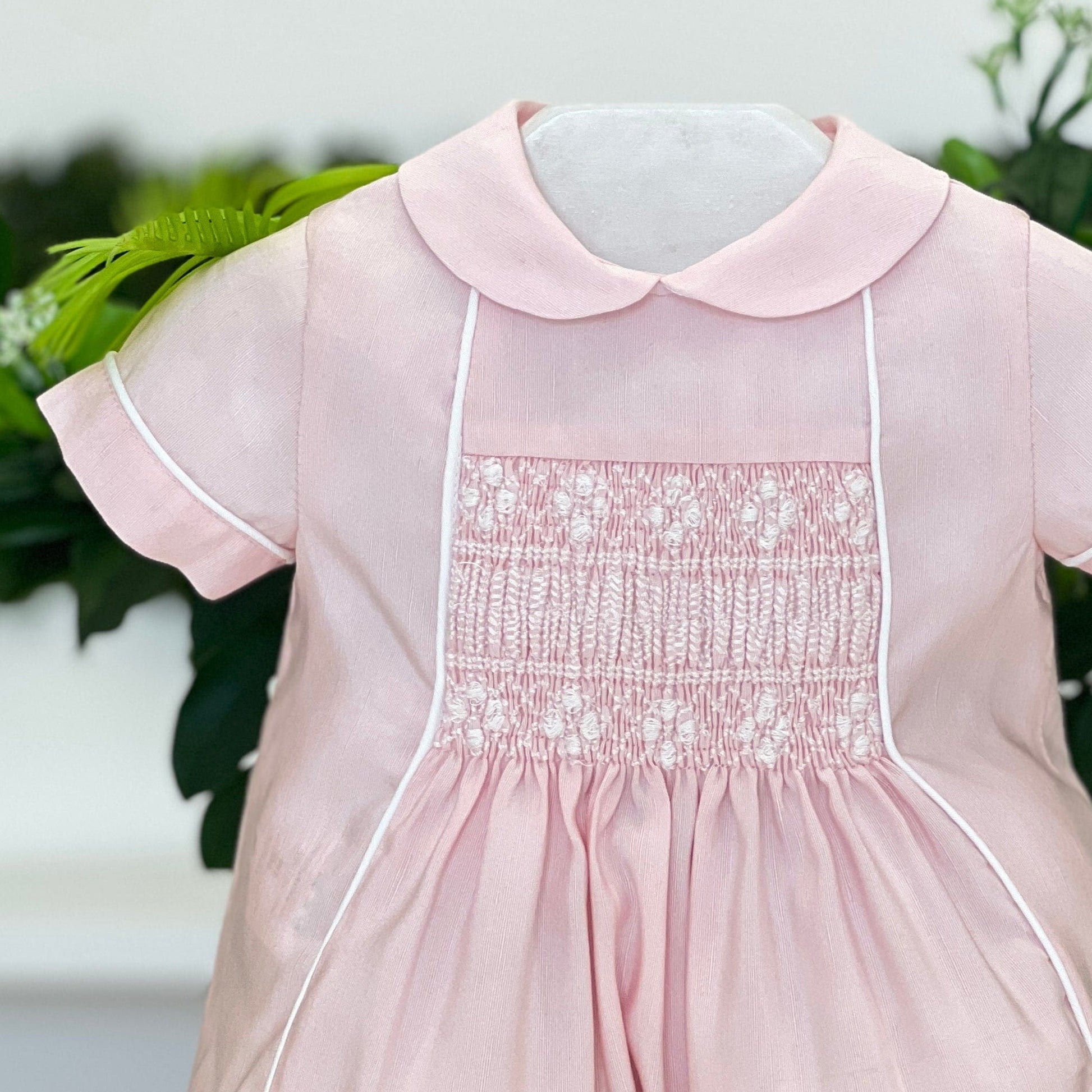 Pagliaccetto per neonata in shantung, caratterizzato da un elegante punto smock e un raffinato colletto. Un capo senza tempo, che unisce classicità e delicatezza per un look impeccabile e raffinato.