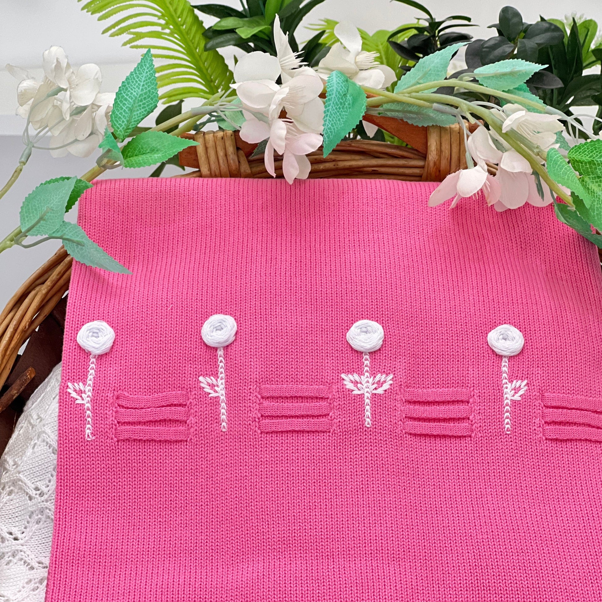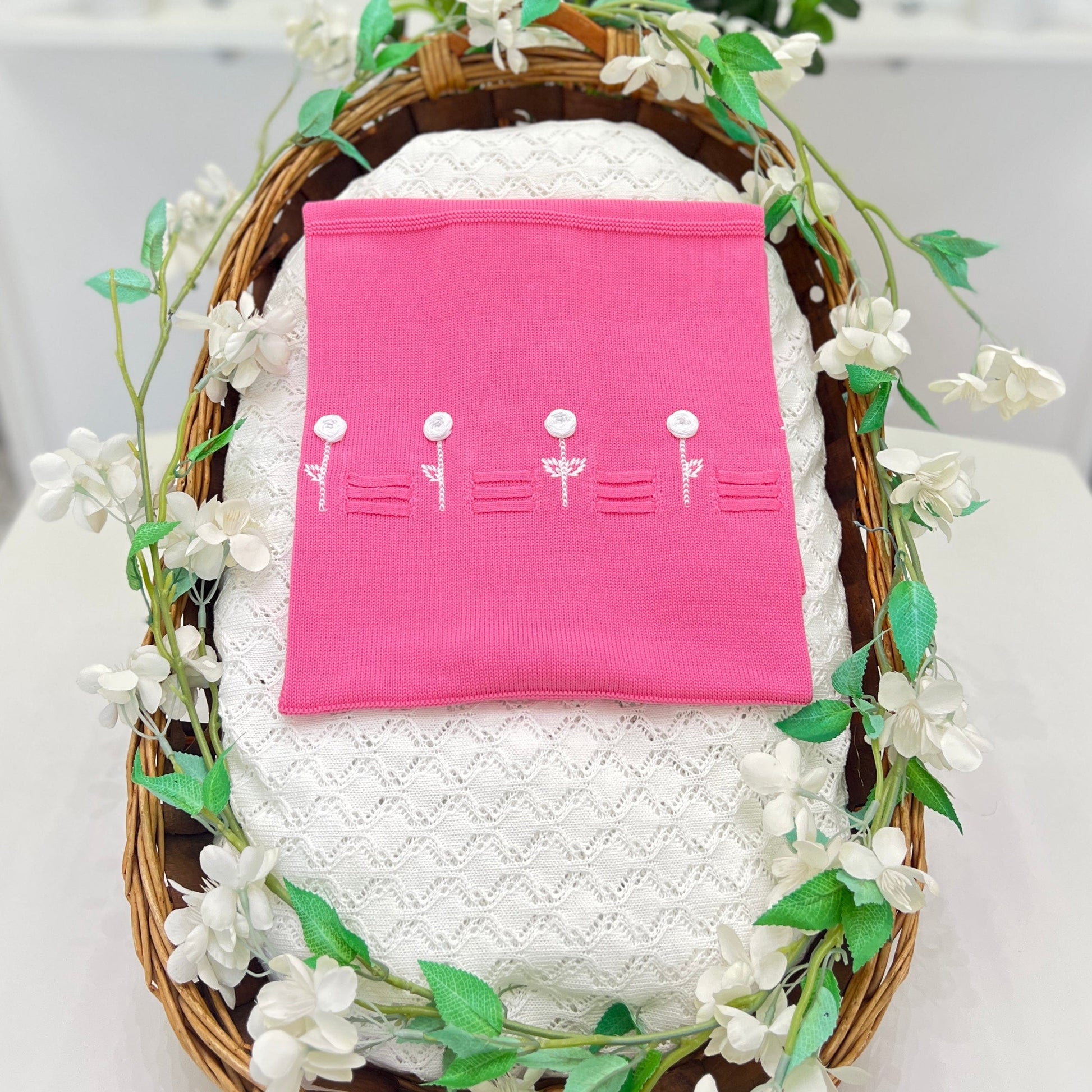 Coperta in filo di cotone fucsia, decorata con raffinati fiori ricamati in bianco. Un accessorio elegante e delicato, ideale per le prime coccole.