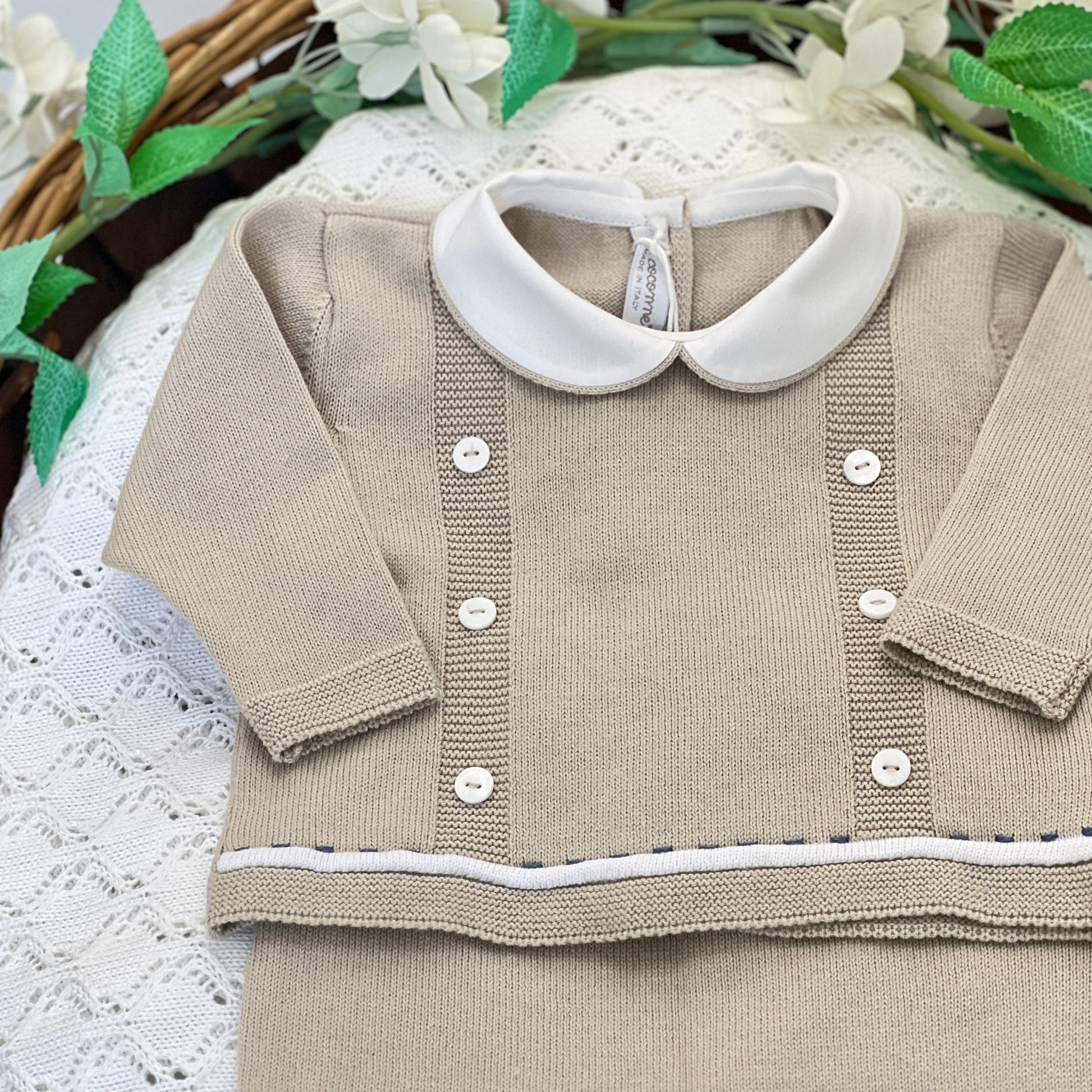Tutina spezzata in filo di cotone beige, con bottoncini bianchi a contrasto. Un capo dallo stile classico e curato nei dettagli, perfetto per ogni occasione.