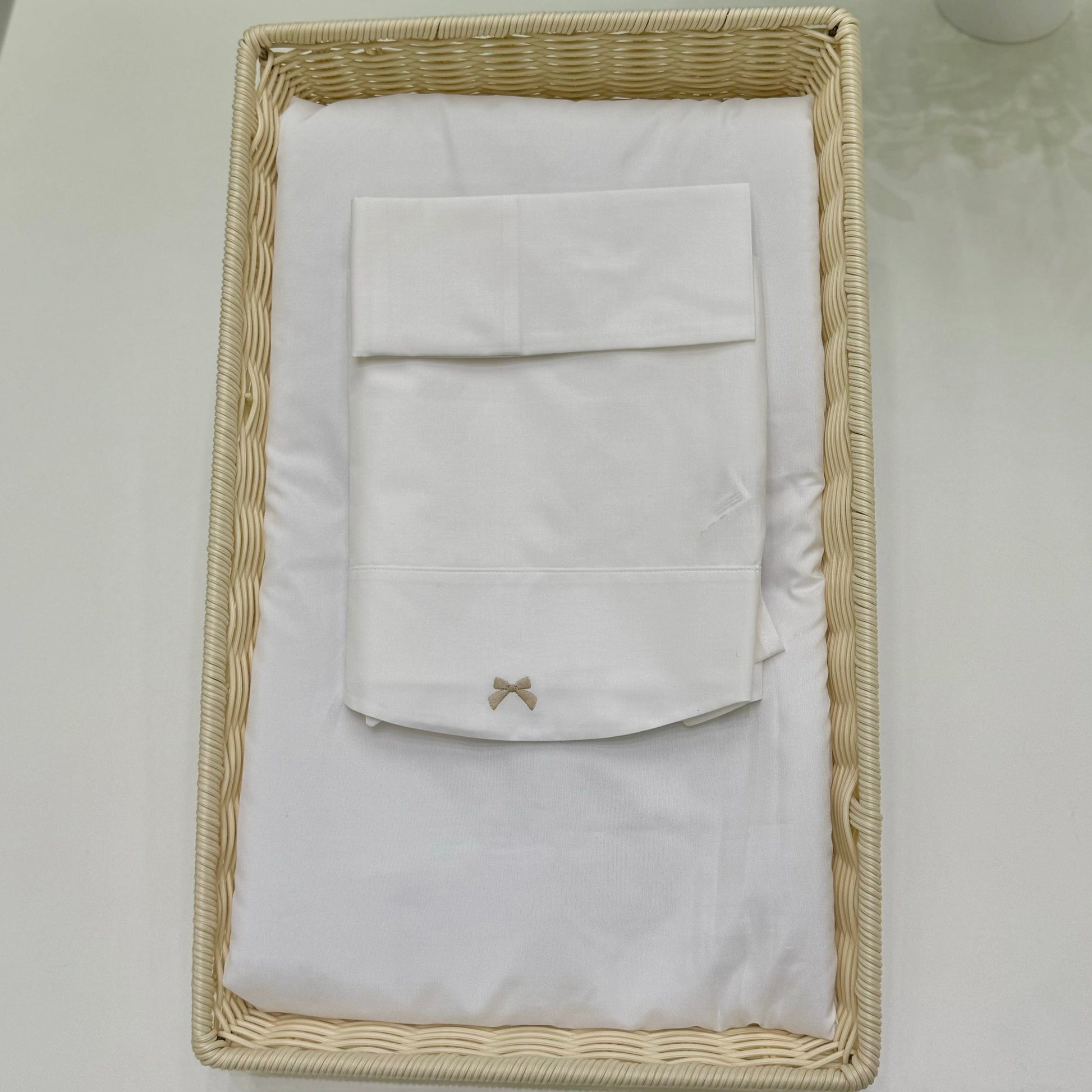 Set Lenzuola per carrozzino tre pezzi in puro cotone biologico, con fiocco ricamato.