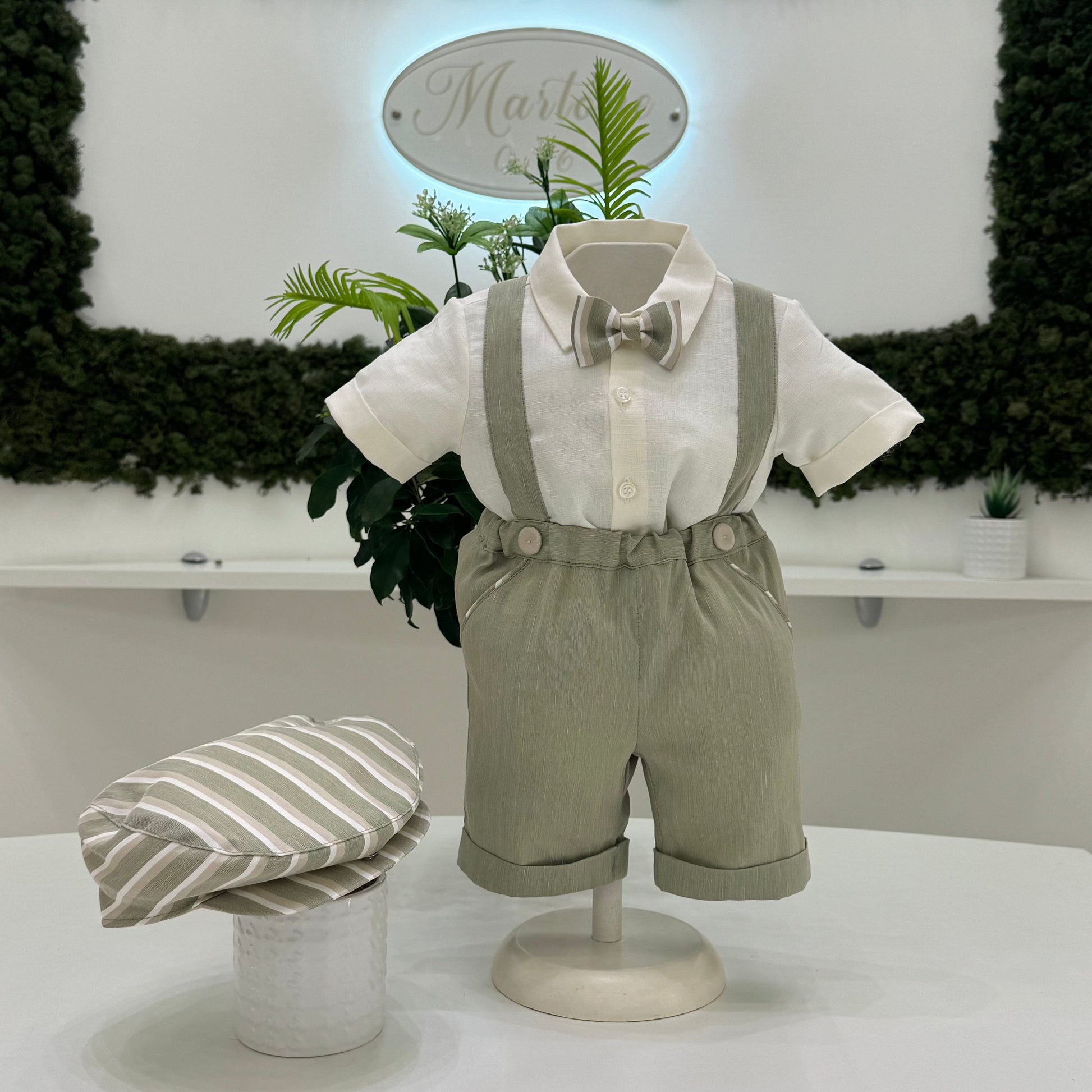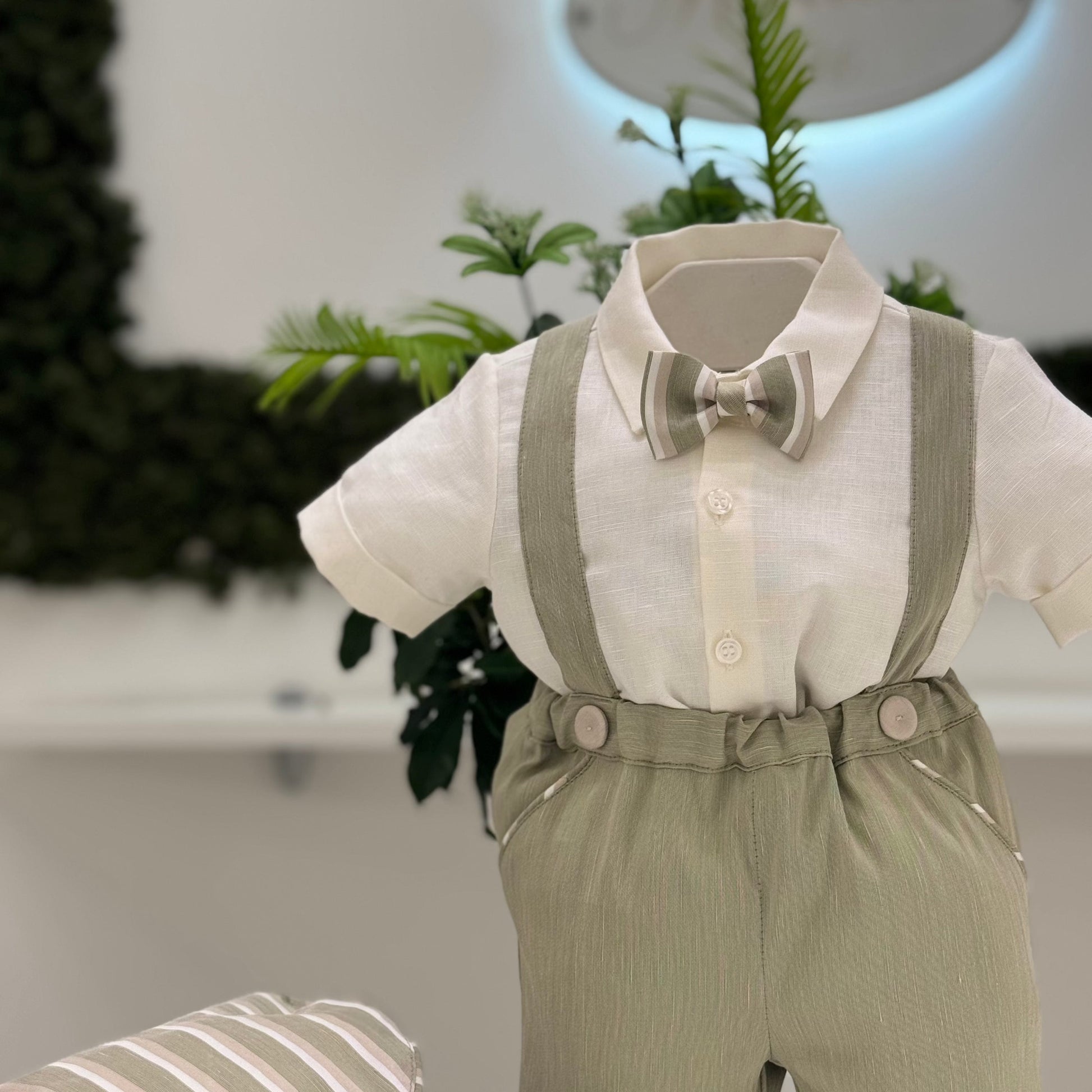 Completo due pezzi composto da una camicia body in cotone operato, che unisce comfort ed eleganza con il suo tessuto raffinato e delicato. I bermuda con bretelle sono caratterizzati da profili sulle tasche che aggiungono un tocco di stile. Completano il look un papillon a righe, che dona un accento vivace e sofisticato. Un outfit perfetto per le occasioni speciali, con un mix di eleganza e praticità.