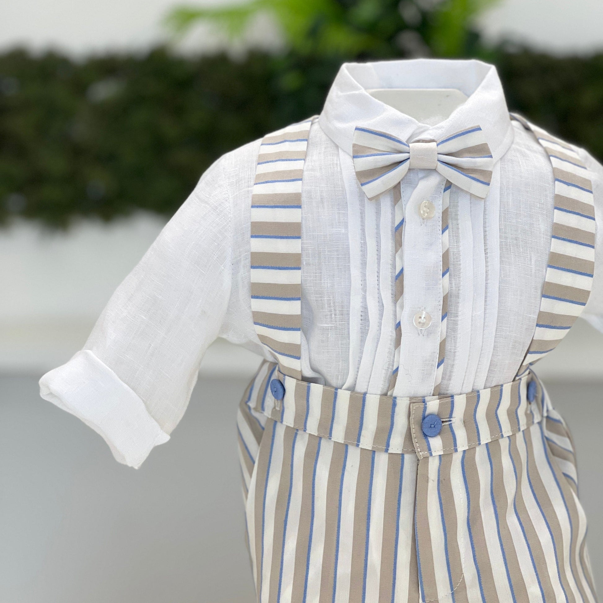 Completo elegante battesimale in lino, composto da pantaloncino con bretelle a righe e camicia coordinata, arricchita da un papillon tono su tono. Un look raffinato e sofisticato, ideale per le occasioni più speciali.