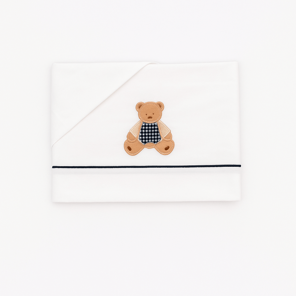 Set lenzuola per culla in puro cotone, caratterizzato da un raffinato decoro orsetto applicato al centro, con dettagli in velluto e gilet fantasia coordinato alla copertina. Comprende federa, lenzuolo sopra e sotto con angoli. Morbido e delicato sulla pelle, pensato per offrire comfort e stile al corredino del neonato.