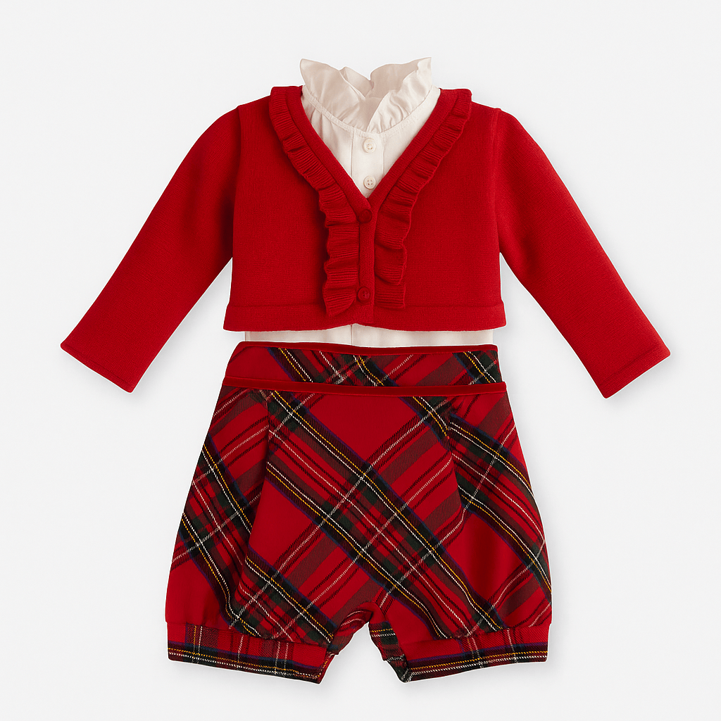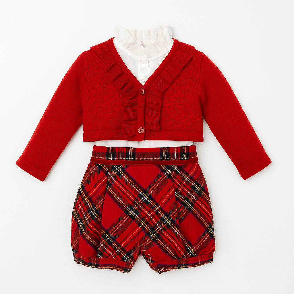 Completo con cardigan rosso impreziosito da volant frontale, camicia con colletto arricciato e pantaloncini in tartan. Un classico di carattere, pensato per momenti speciali.