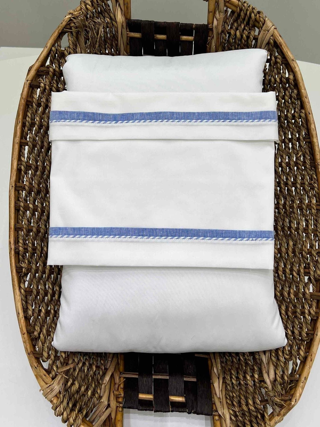 Lenzuolo neonato in cotone con bordatura a contrasto blu a righe.