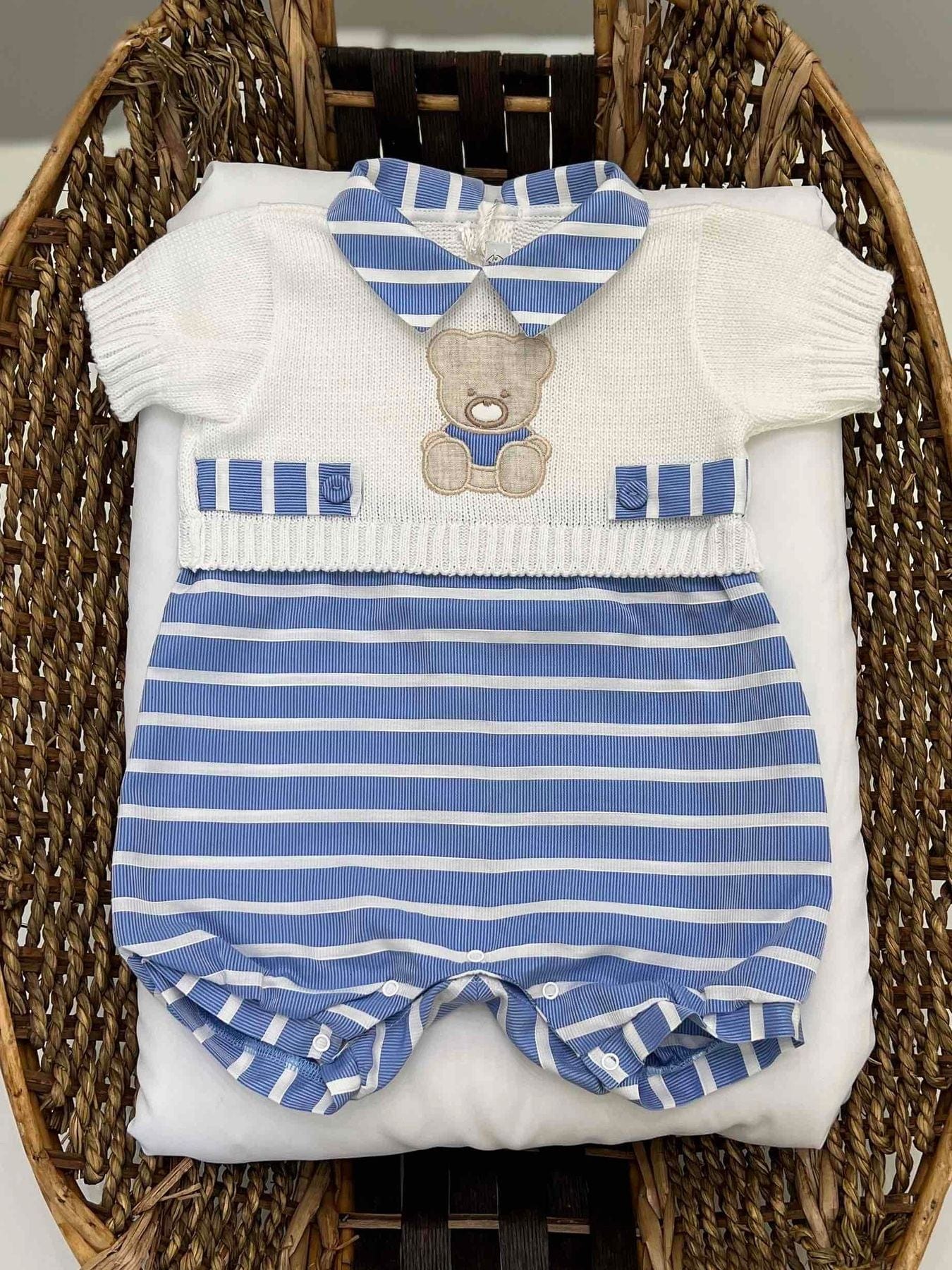 Pagliaccetto neonato a manica corta con dettagli a righe ed orsetto stampato.
