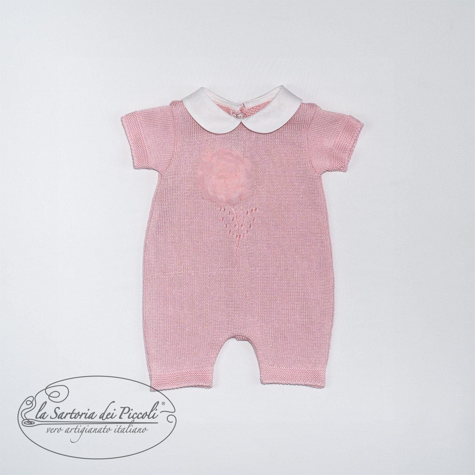 Pagliaccetto in filo di cotone rosa con colletto bianco, decorato con eleganti fiori tridimensionali. Un capo delicato e raffinato, perfetto per valorizzare con dolcezza le prime occasioni speciali.