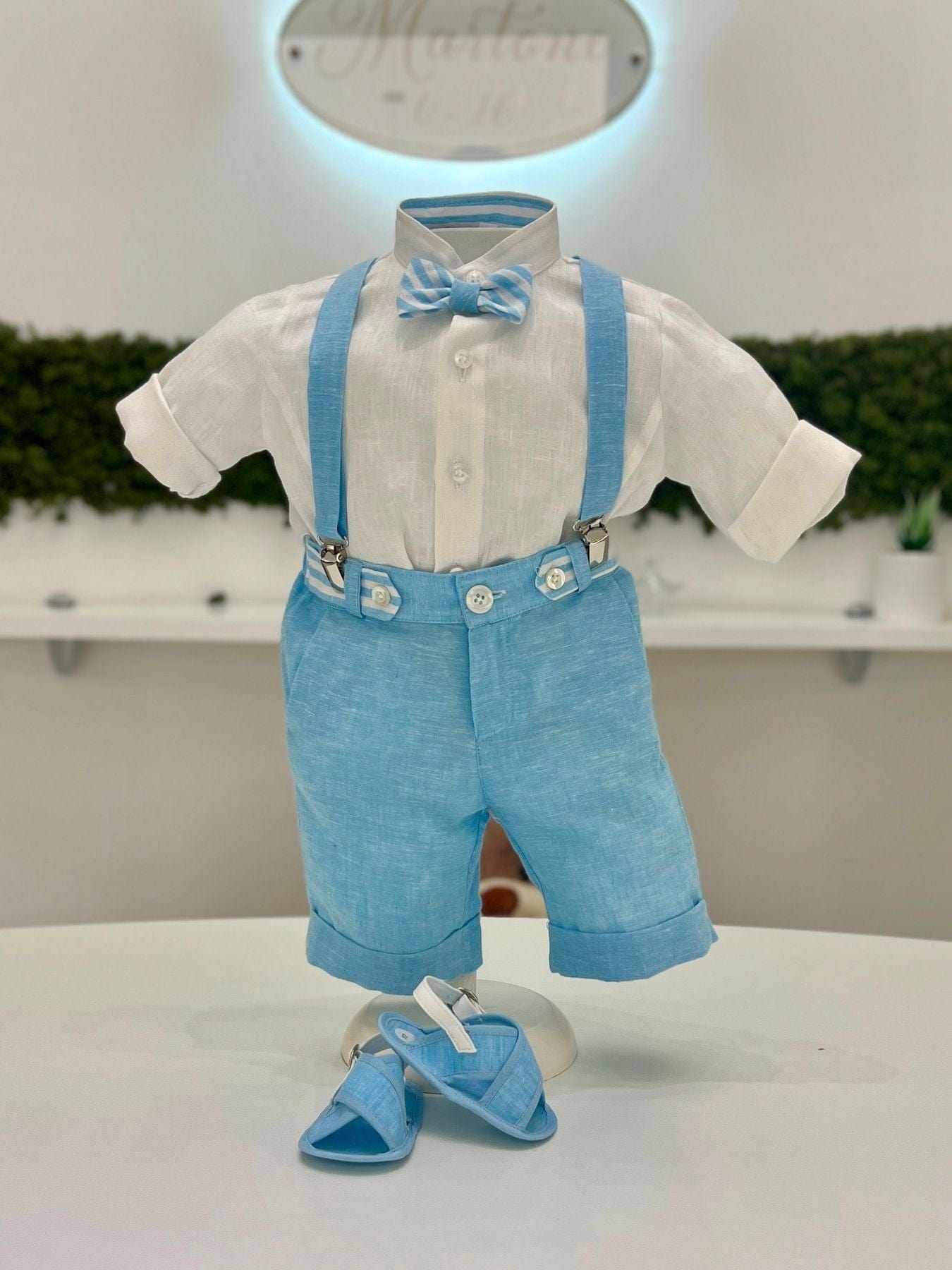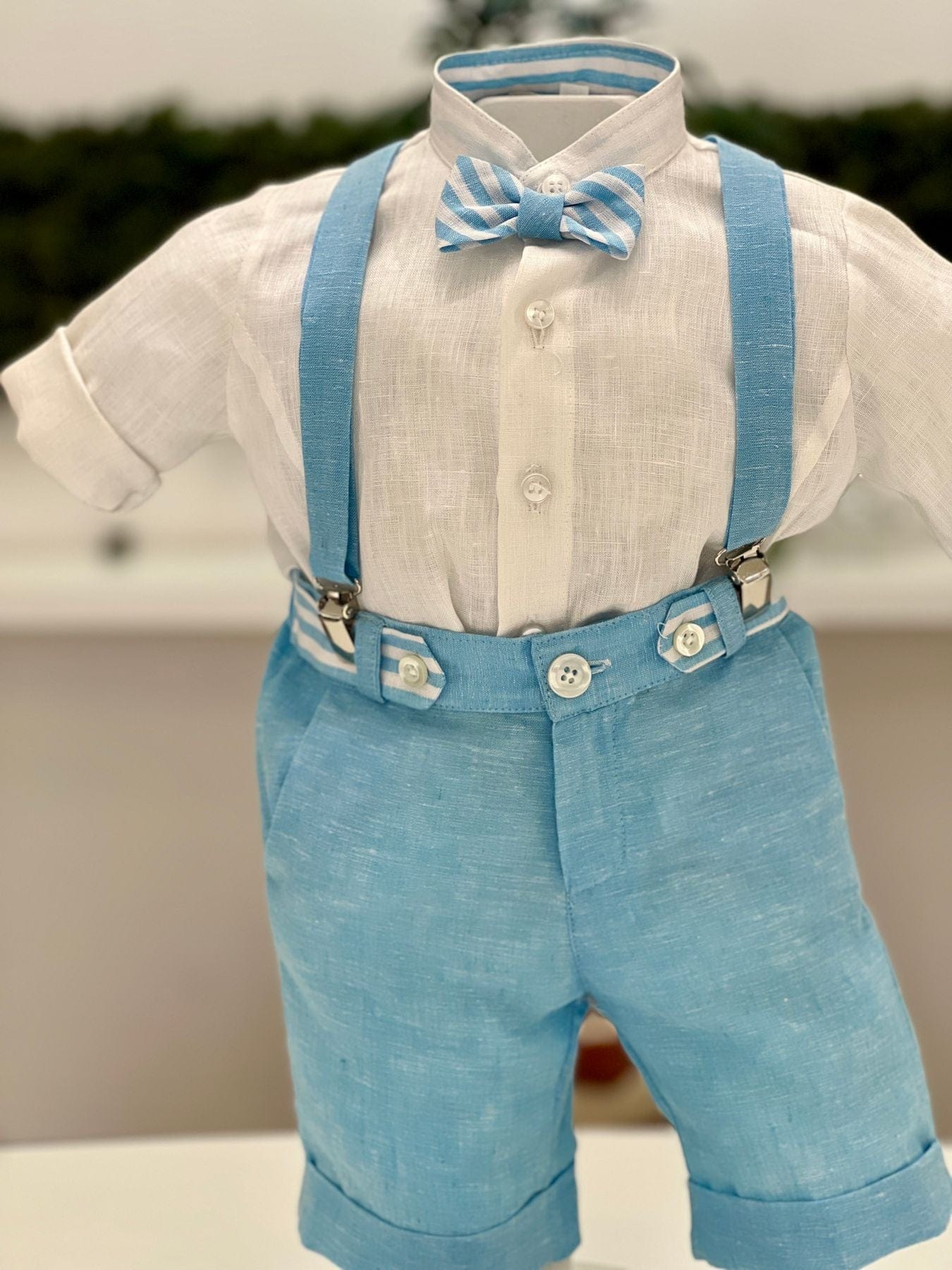 Completo quattro pezzi in lino composto da camicia con collo coreano e bordi a contrasto, bermuda celeste con dettaglio a righe, bretelle e papillon coordinati.