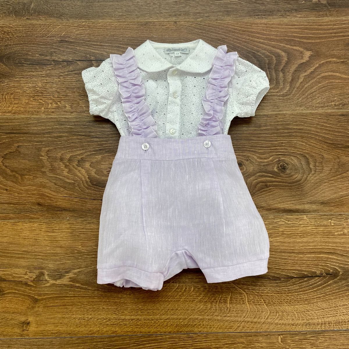 Completo con pantaloncino con bretelle in lino e camicia in pizzo san gallo.