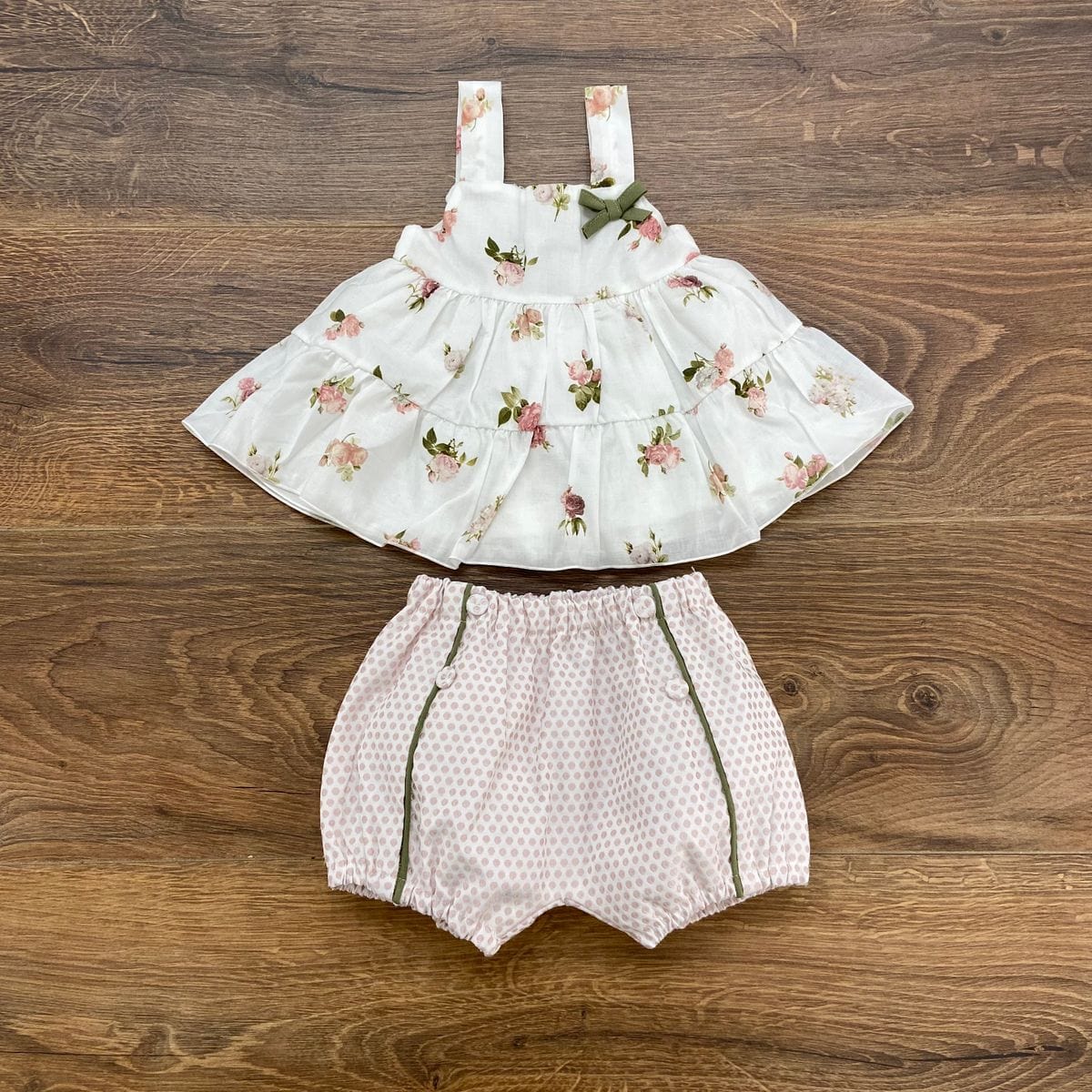 Completo due pezzi con top floreale e pantaloncino a pois.