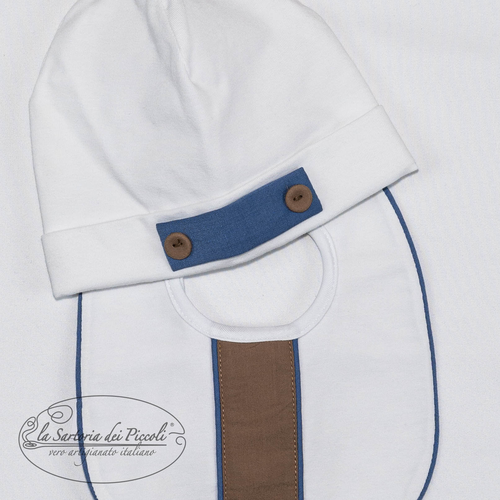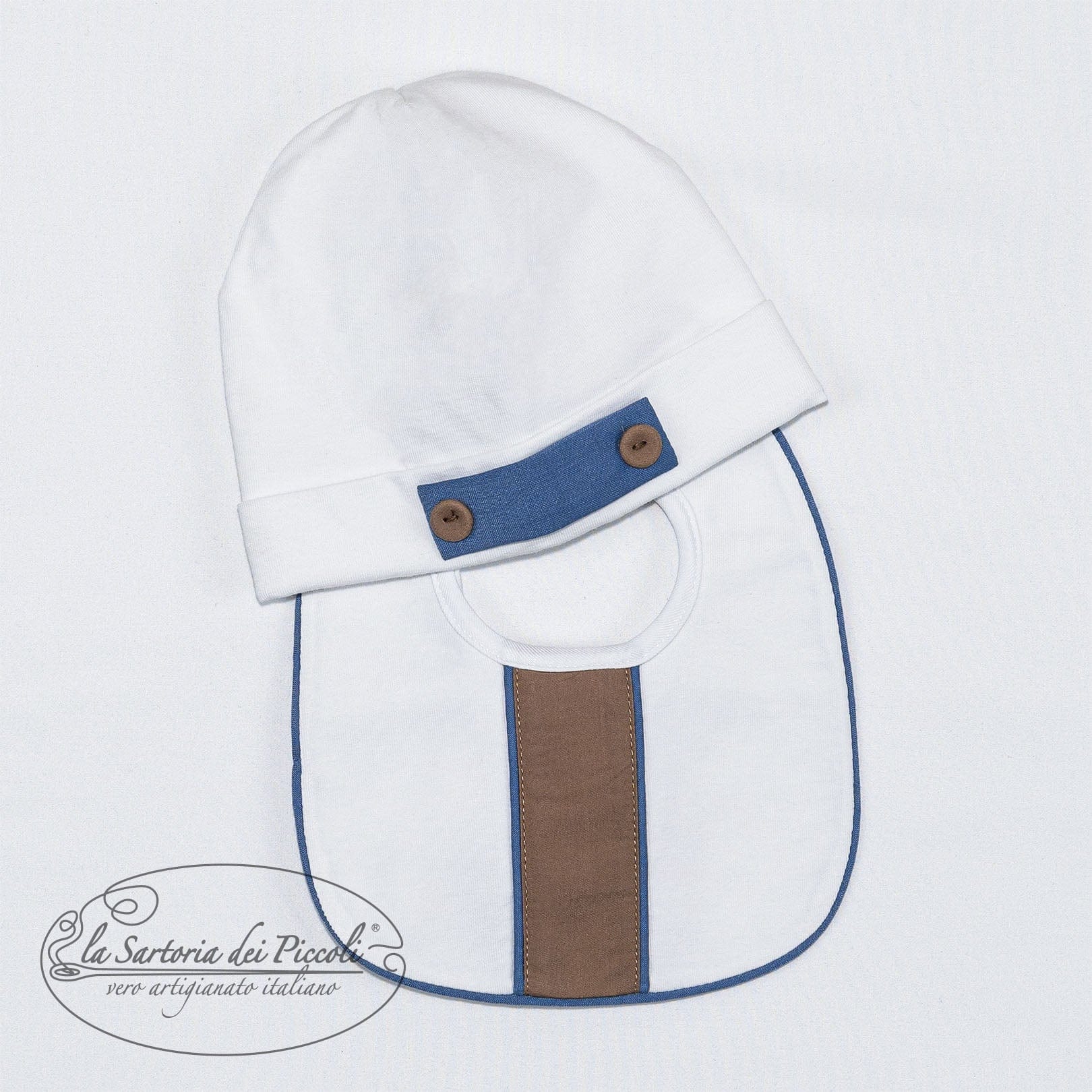 Coordinato cappello e bavetta in puro cotone, bianco con delicati dettagli beige e blu. Un set pratico ed elegante, ideale per completare con stile il look del tuo neonato.