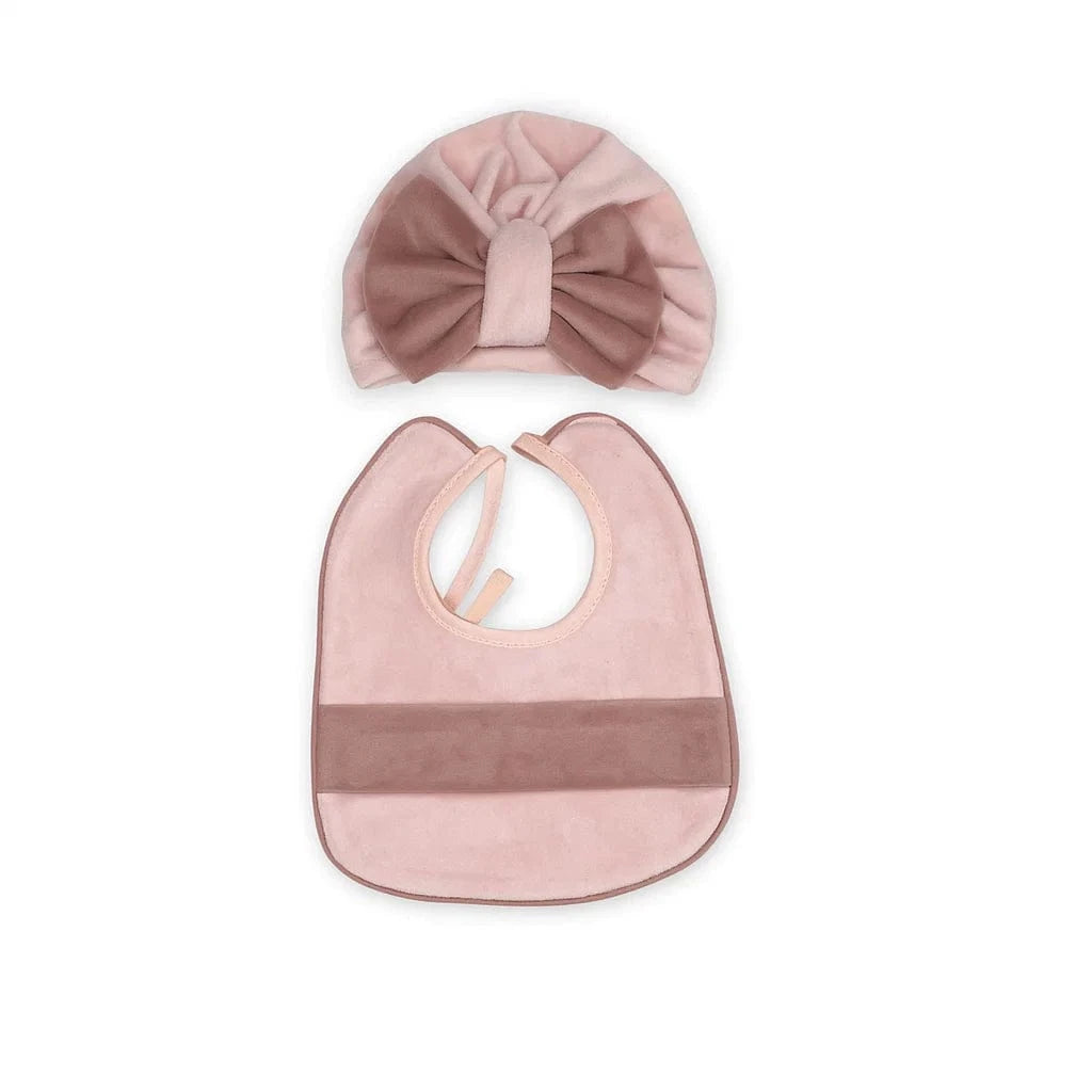 Set accessori per neonata composto da cappello in velluto con fiocco applicato e bavetta in cotone con dettaglio in velluto coordinato.