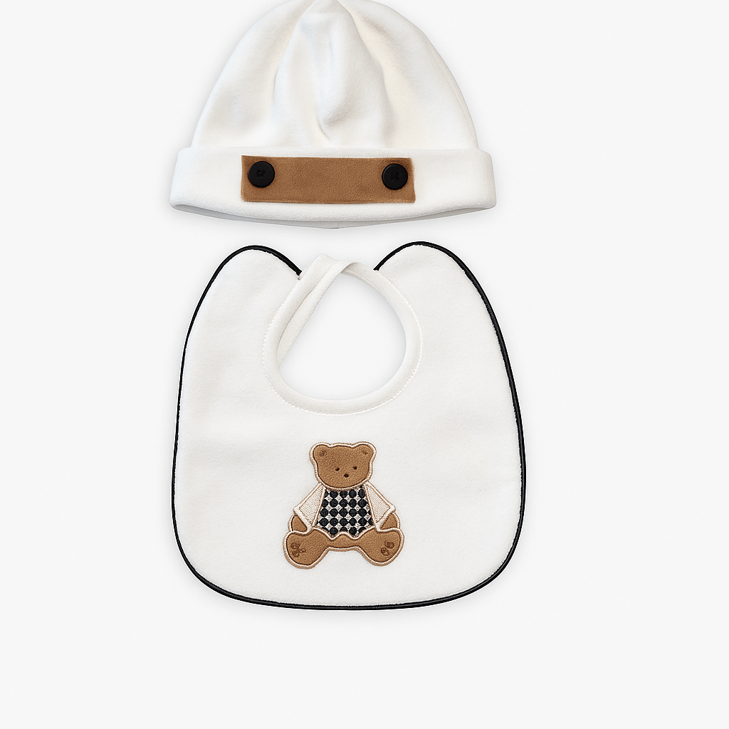 Set accessori per neonato composto da cappello in ciniglia con bordo a contrasto e bavetta coordinata con orsetto ricamato.