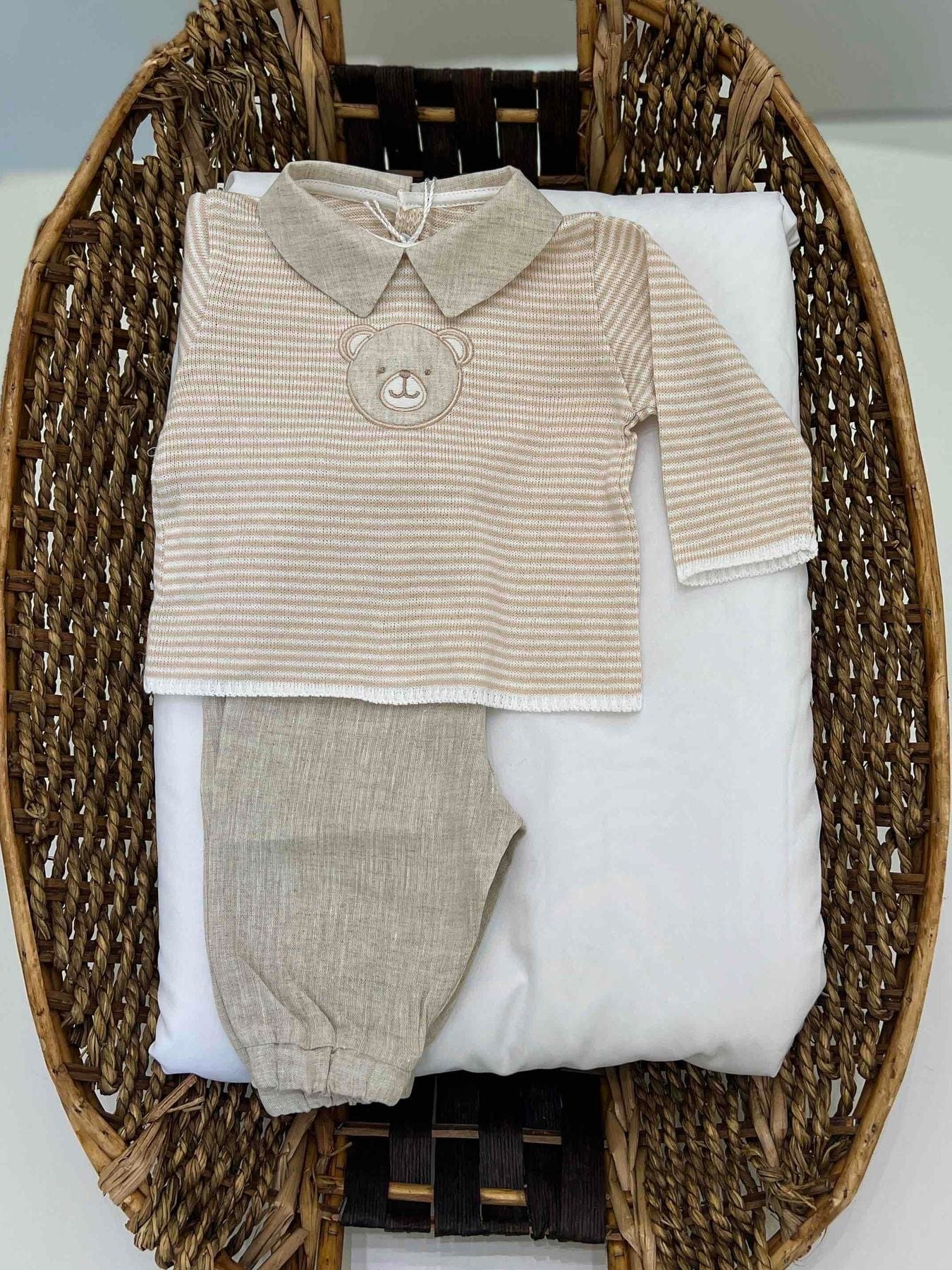 Completo clinico neonato due pezzi composto da maglia a righe in cotone e pantalone in lino.