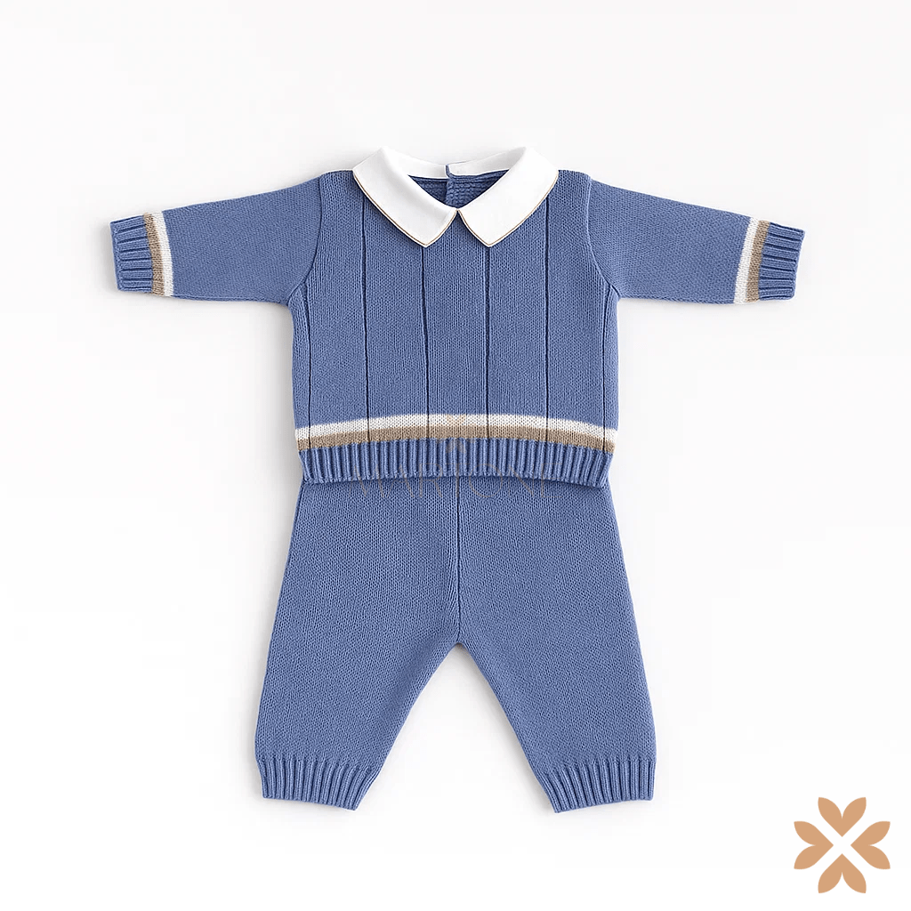 Completo due pezzi in maglia azzurra composto da maglia con colletto bianco in tessuto liscio, lavorazione a coste verticali e dettaglio panna su vita e polsini, abbinata a pantalone in tinta unita con bordo a costine. Elegante e pratico, ideale per cerimonie e prime occasioni speciali.