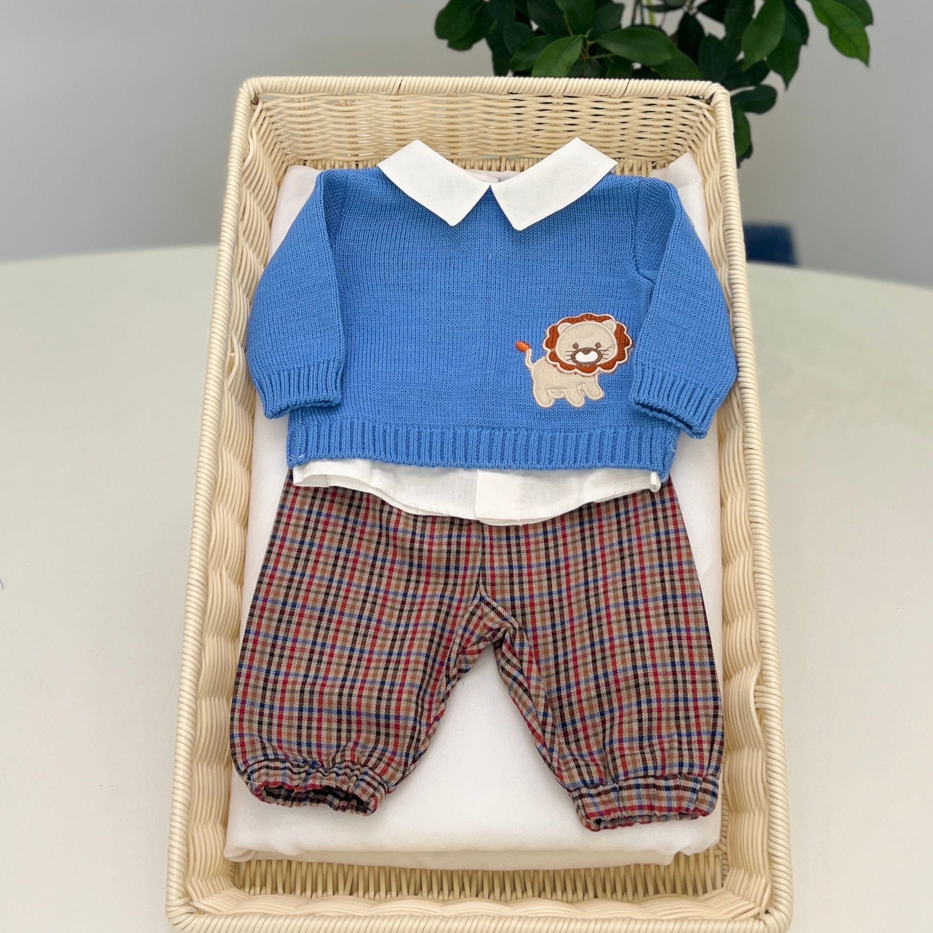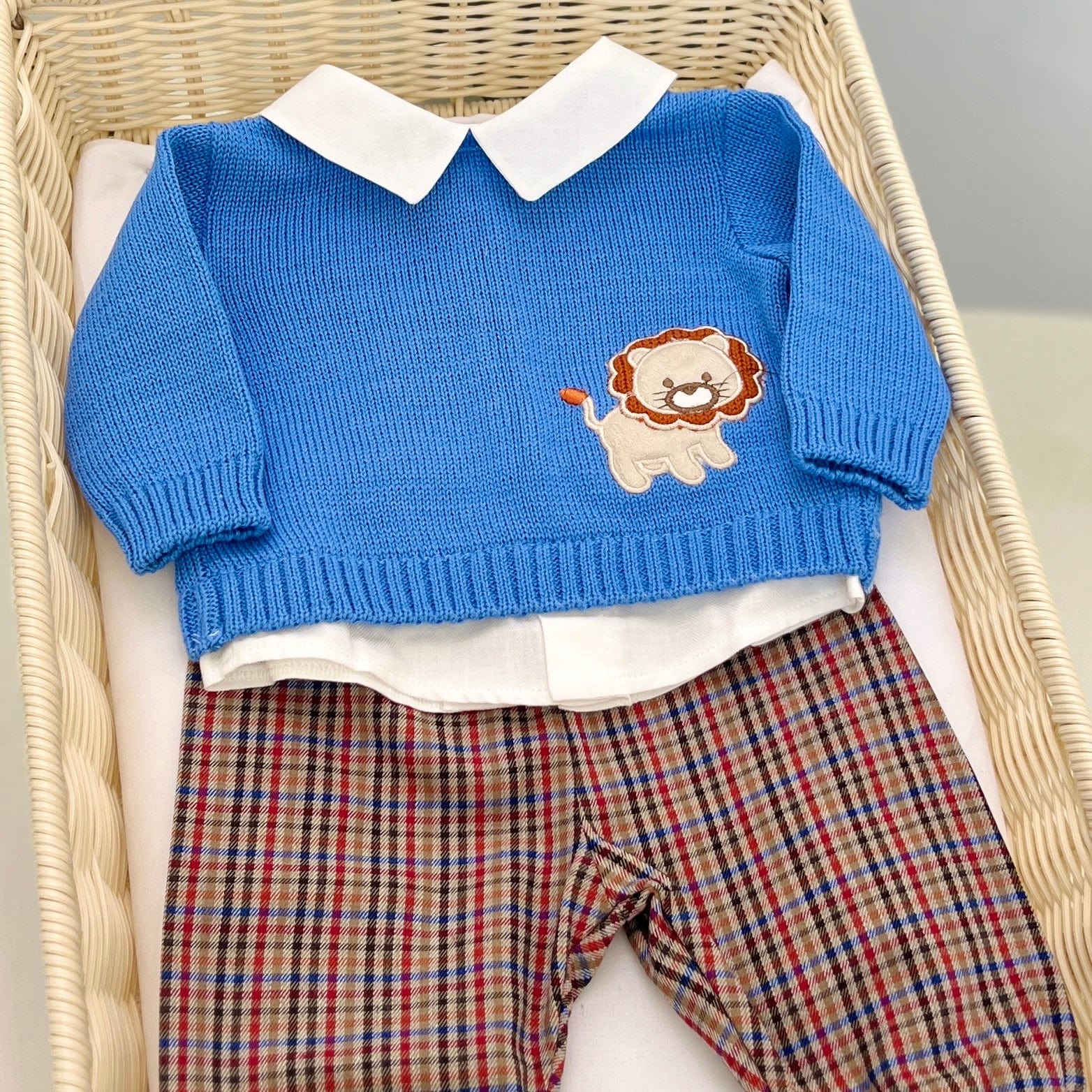Maglia in misto lana azzurra con bordo camicia e pantalone microfantasia con elastico.