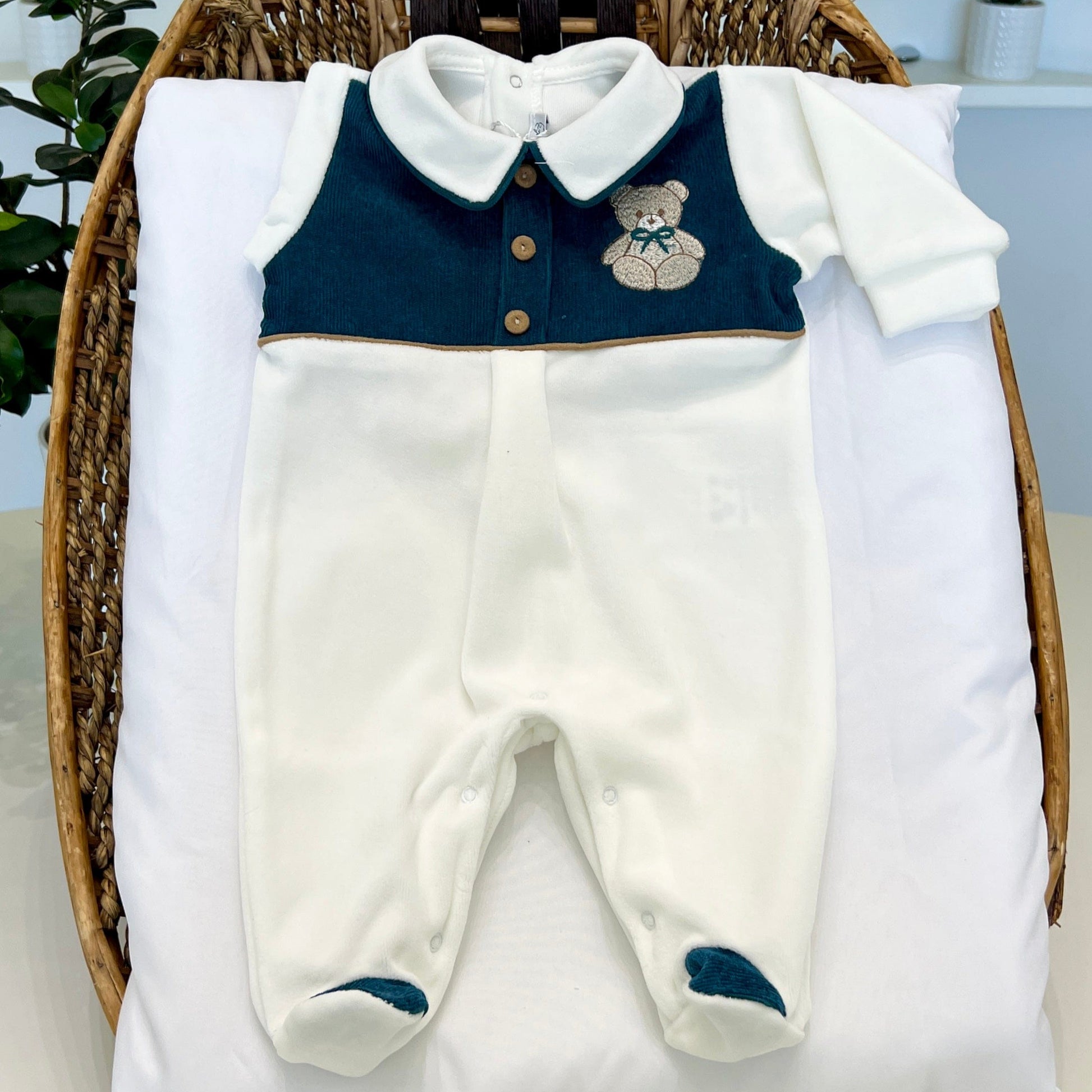 Questa tutina in ciniglia per neonato maschio è ideale per l'inverno, caratterizzata da un pezzo di stoffa in velluto verde petrolio sul petto. Il design elegante è arricchito da un orsetto ricamato, aggiungendo un tocco di dolcezza. Calda e morbida, offre comfort e stile durante i mesi freddi.