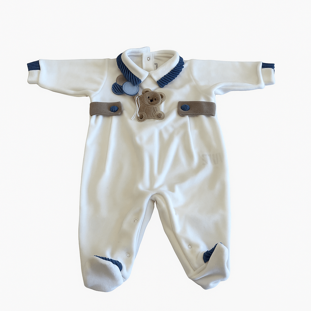 Tutina intera per neonato in ciniglia con dettagli a contrasto e orsetto applicato sul davanti. Chiusura con bottoni a pressione sul retro e sul cavallo.