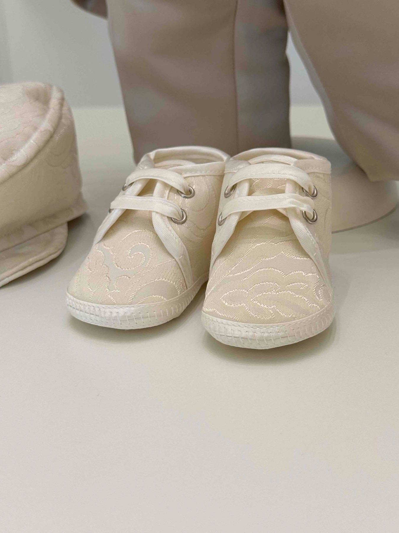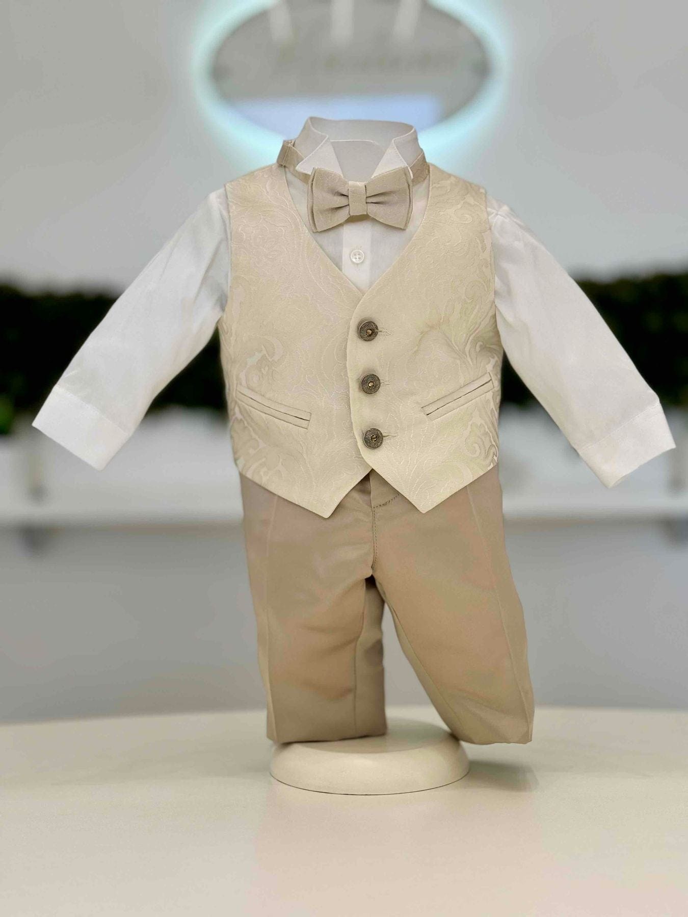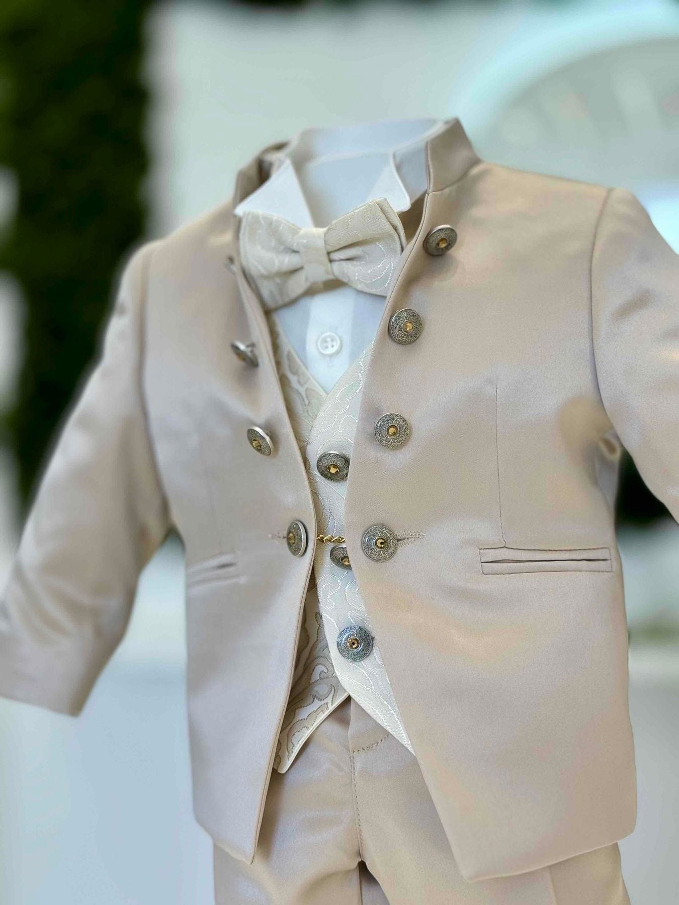 Vestito Battesimale in beige in taftà in seta, Giacca liscia,gilet damascato, camicia bianca, pantalone beige e papillon che richiama il gilet.Bottoni in stile gioiello.