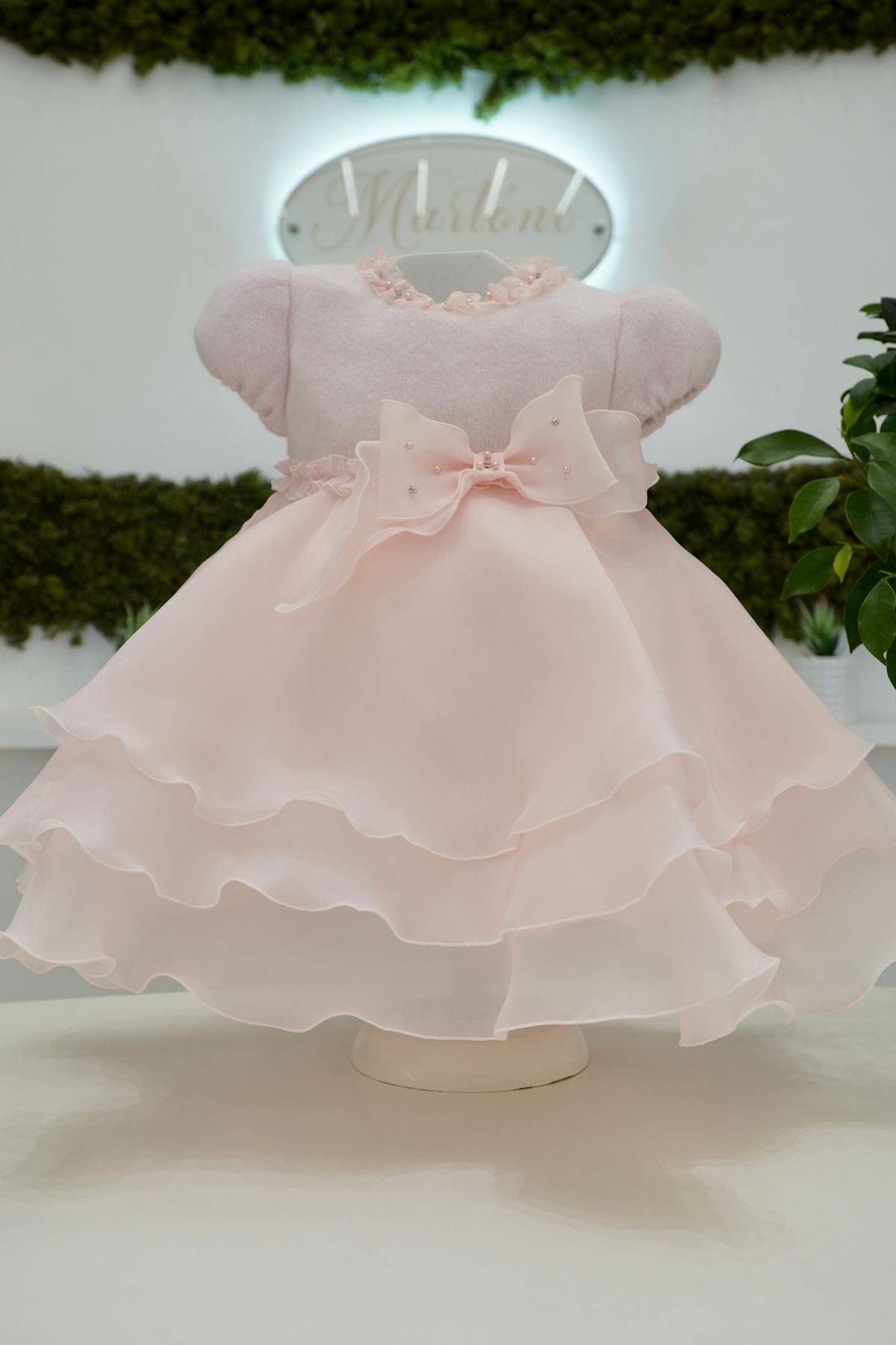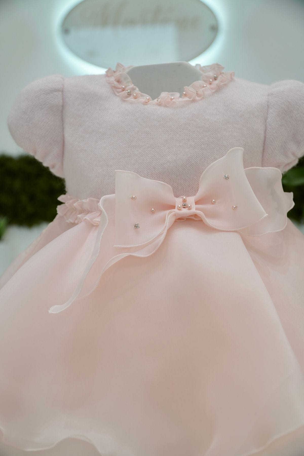 Abito in rosa con corpetto in lana e gonna in organtis di seta completata da fiocco in vita rifinito di perline e swarovski
