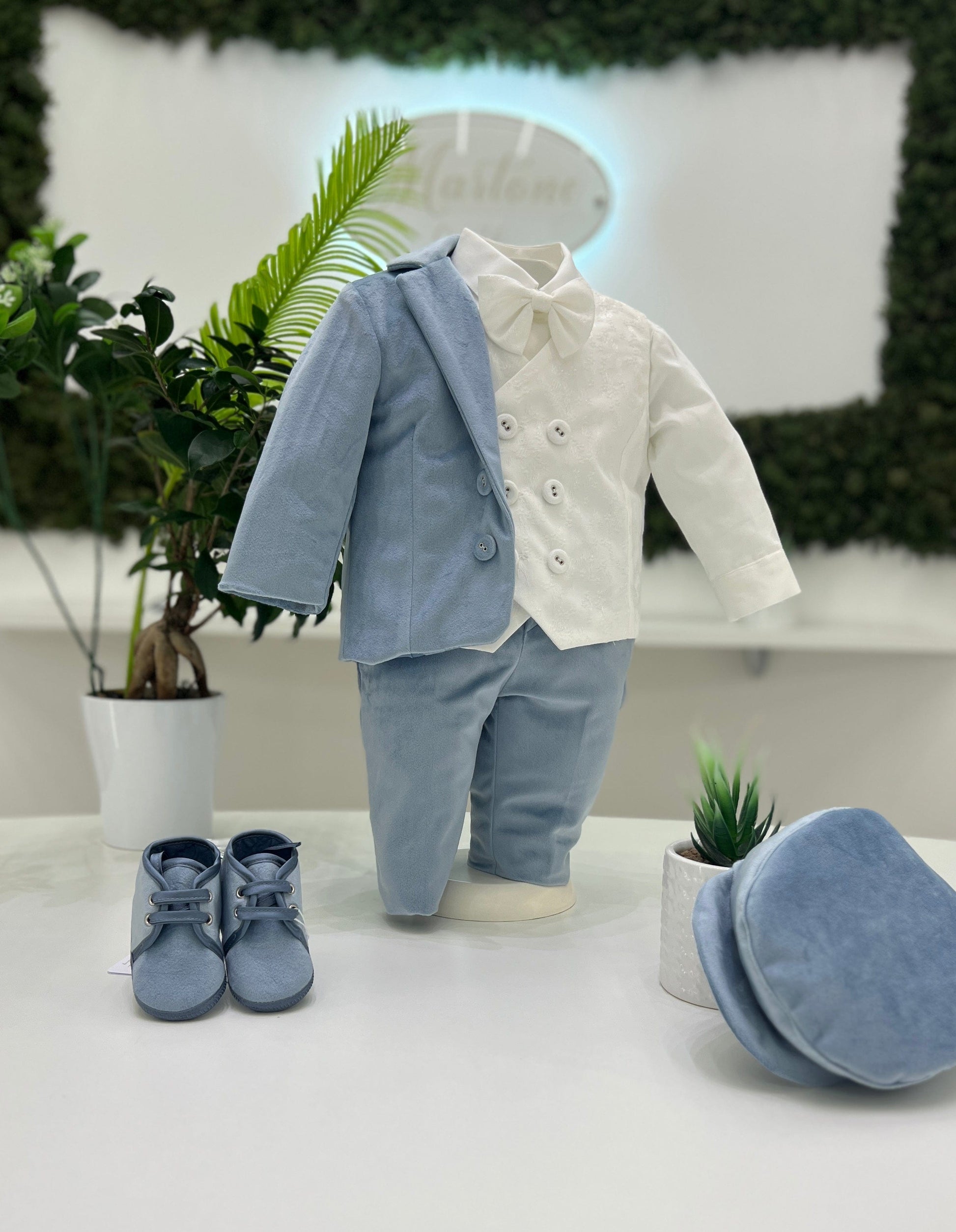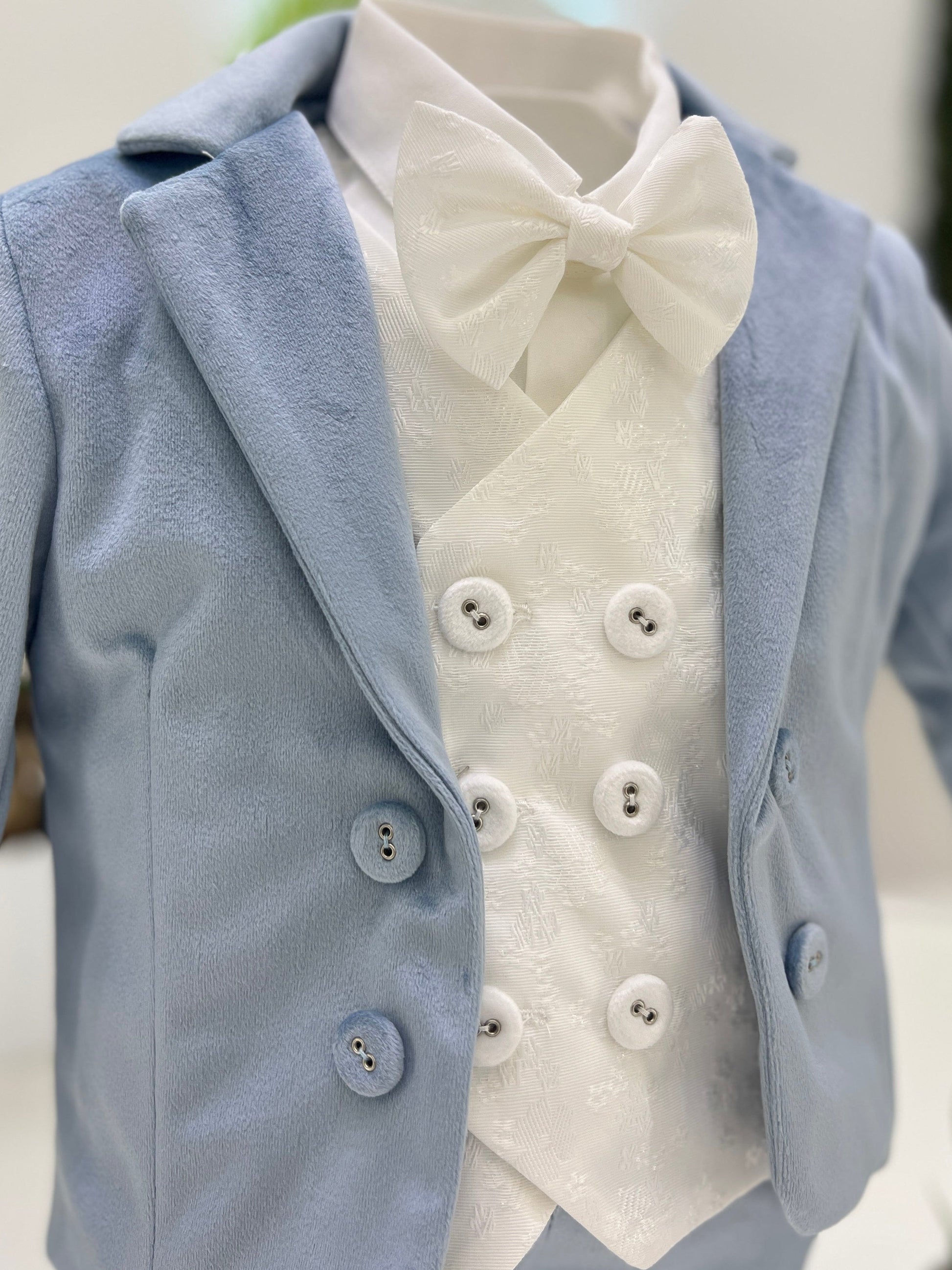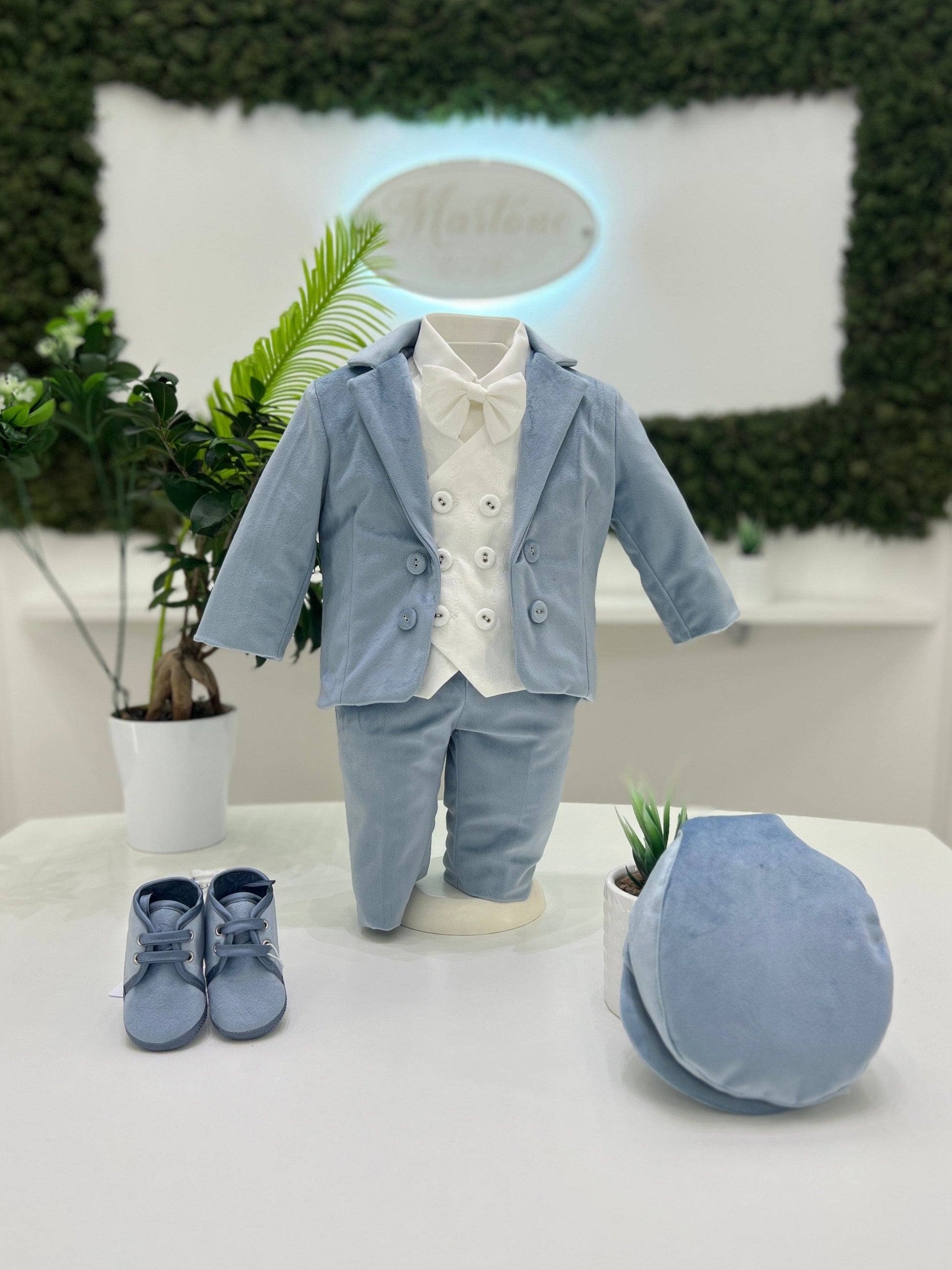 Un abito battesimale per bimbo in velluto azzurro tampone è composto da un elegante blazer senza abbottonatura e pantalone coordinato, entrambi realizzati in morbido velluto. Il completo è arricchito da un gilet doppiopetto in tessuto jacquard color panna, che aggiunge un tocco di raffinatezza. Il look è completato da un papillon coordinato e una camicia classica in cotone bianco, creando un insieme sofisticato e adatto a una cerimonia speciale come il battesimo.