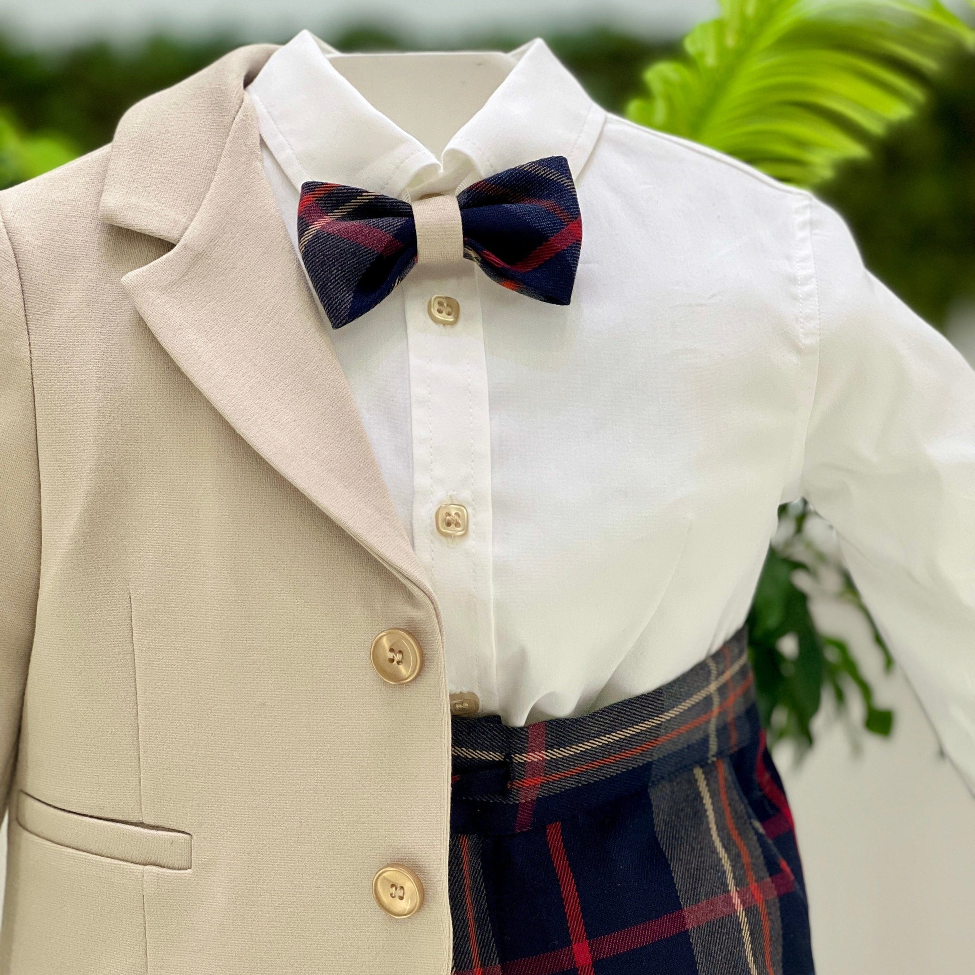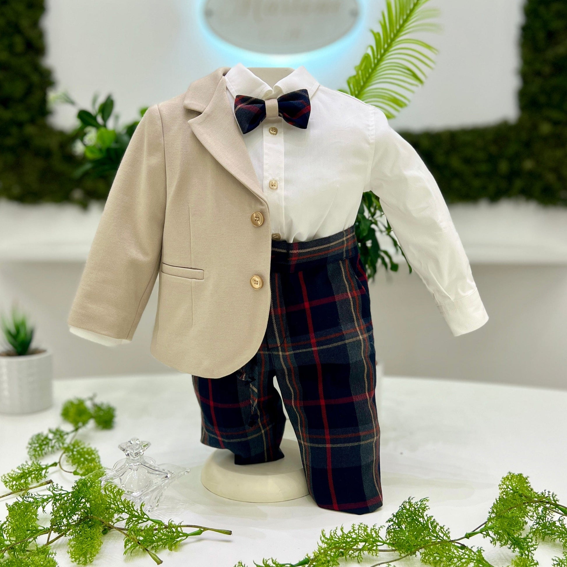 Abito battesimale per neonato composto da una giacca beige in punto Milano offre un look elegante e confortevole, grazie al tessuto morbido e leggermente elasticizzato. La camicia classica bianca in cotone, con il suo design pulito, aggiunge un tocco di freschezza e sobrietà. I pantaloni con lacci presentano una fantasia a quadri raffinata, che si abbina perfettamente al papillon coordinato, creando un insieme armonioso e sofisticato. Questo completo unisce stile e comfort, ideale per una cerimonia speciale come il battesimo.