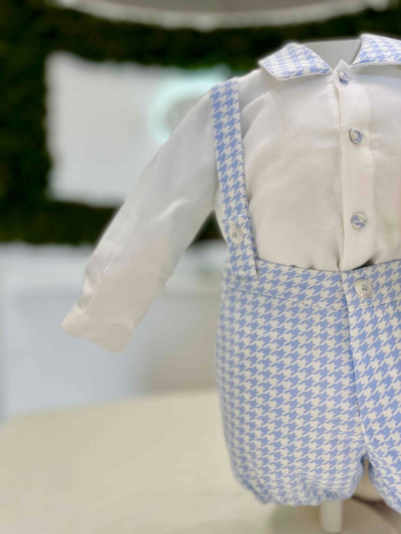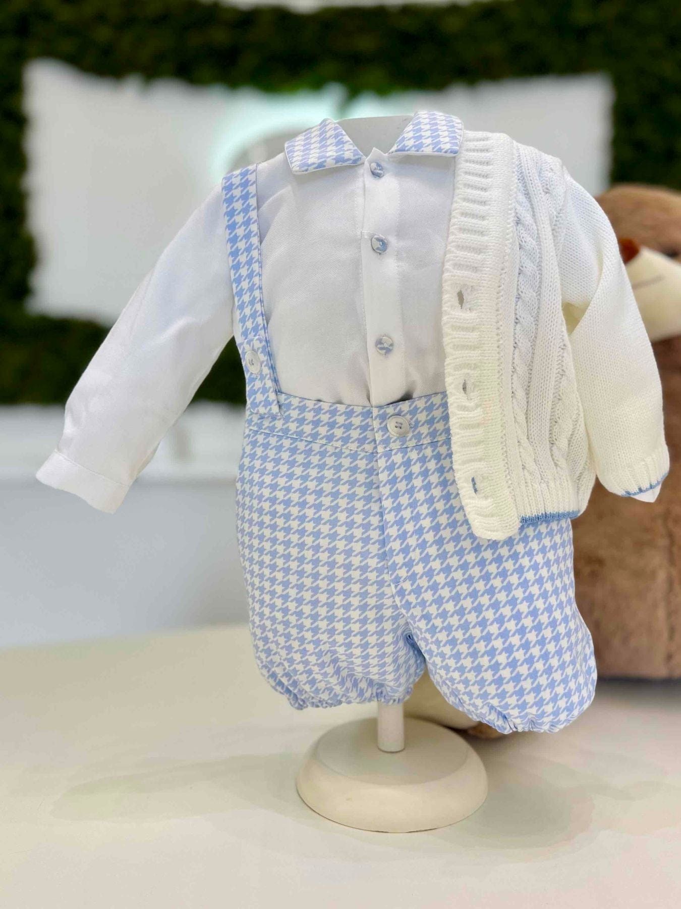 Completo pagliaccetto fantasia cielo con camicia a body e colletto con fantasia del pagliaccetto e cardigan a punta con bordi cielo