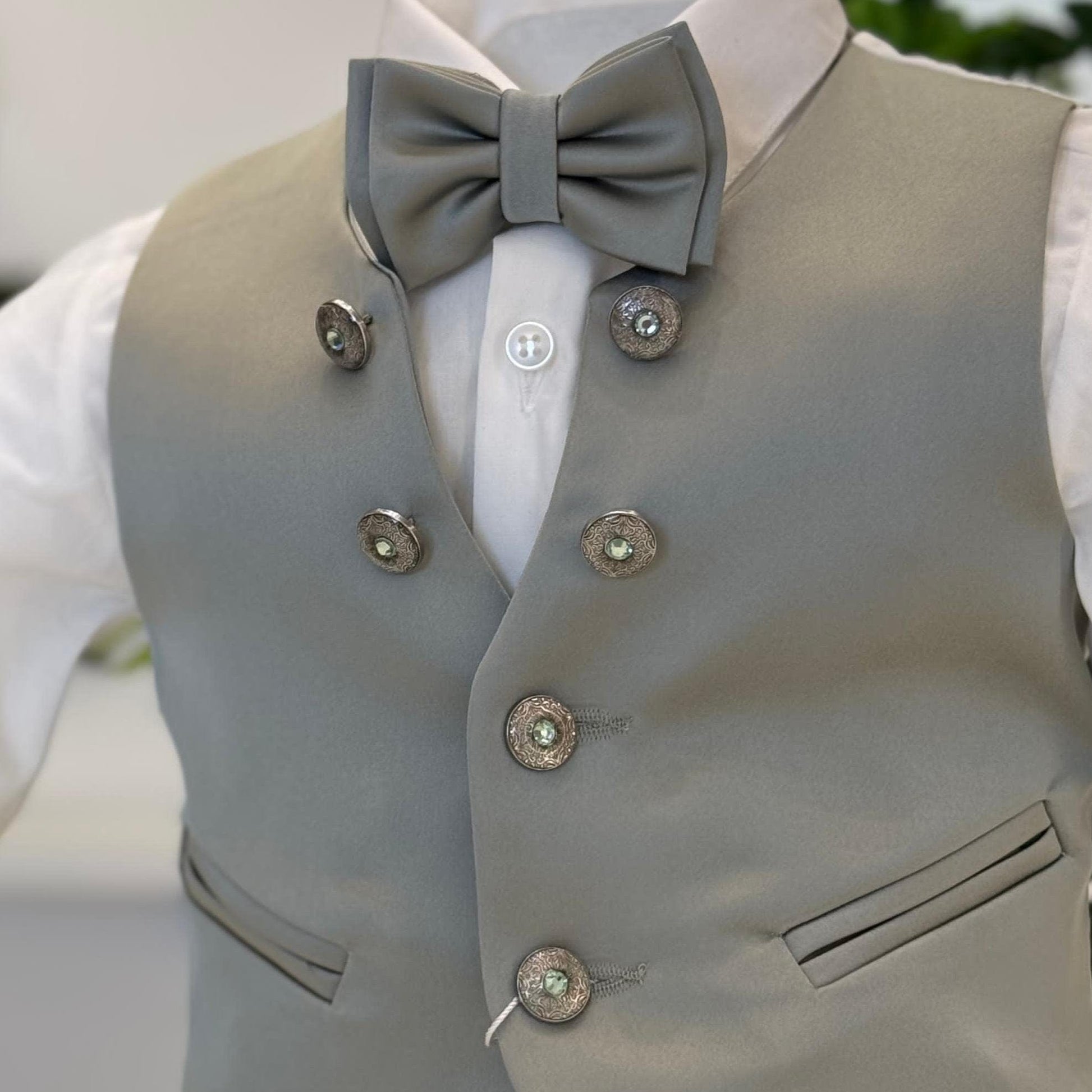 Giacca modello coreano e gilet monopetto con bottoni gioiello. Pantalone classico con tasca america, camicia in cotone e papillon coordinato.