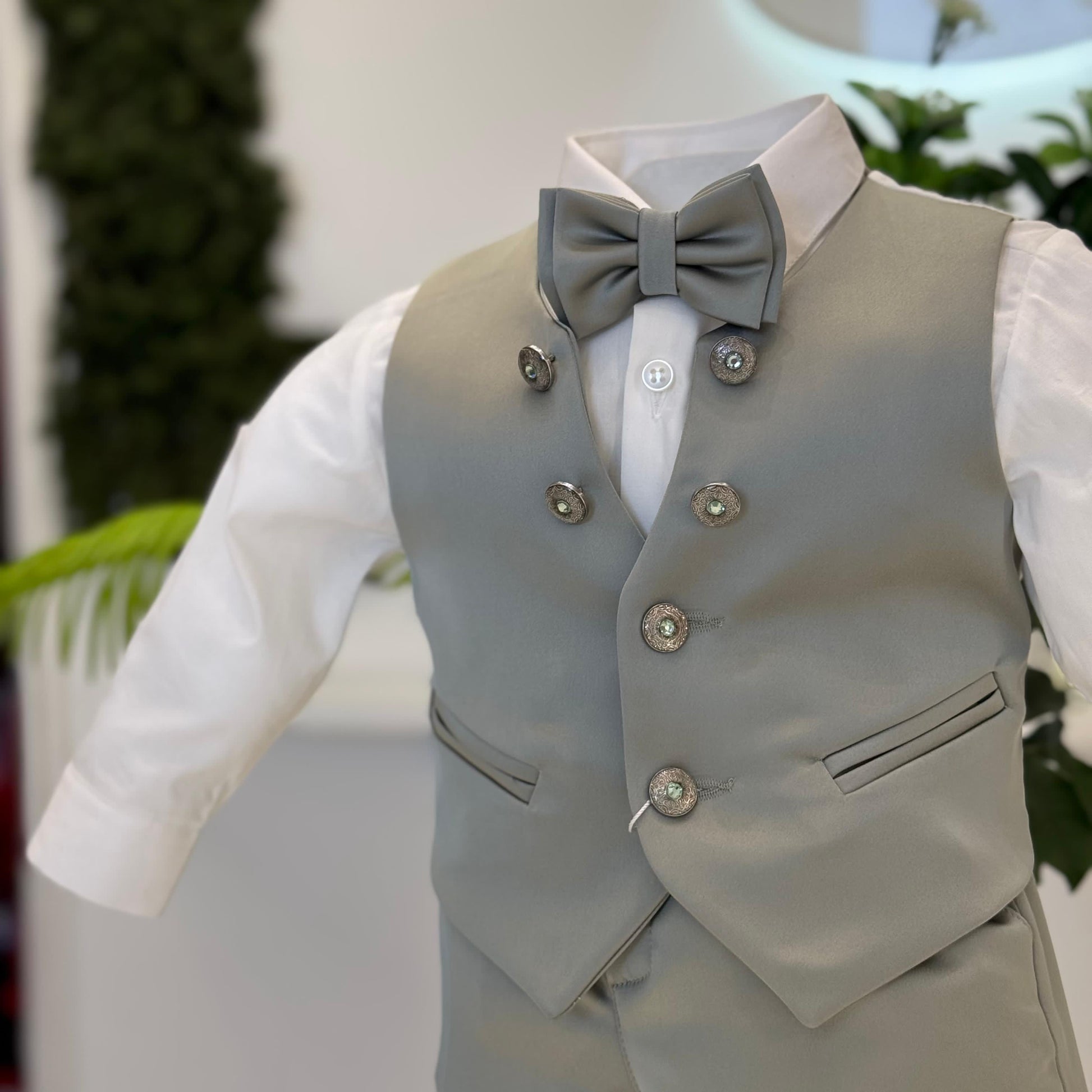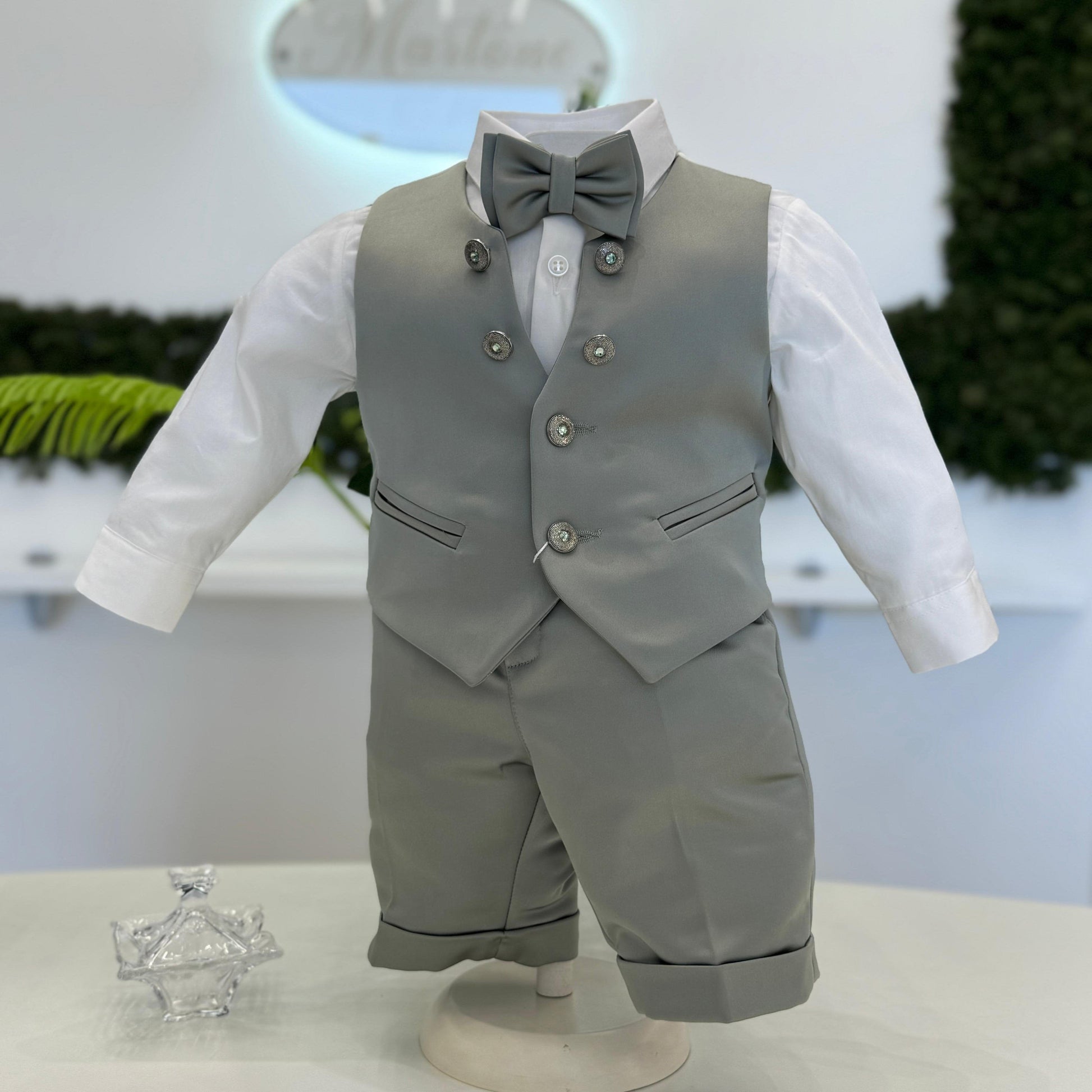 Abito battesimale Sartoriale in mikado, composto da gilet monopetto con bottoni gioiello, bermuda con risvolto, camicia in cotone e papillon coordinato.