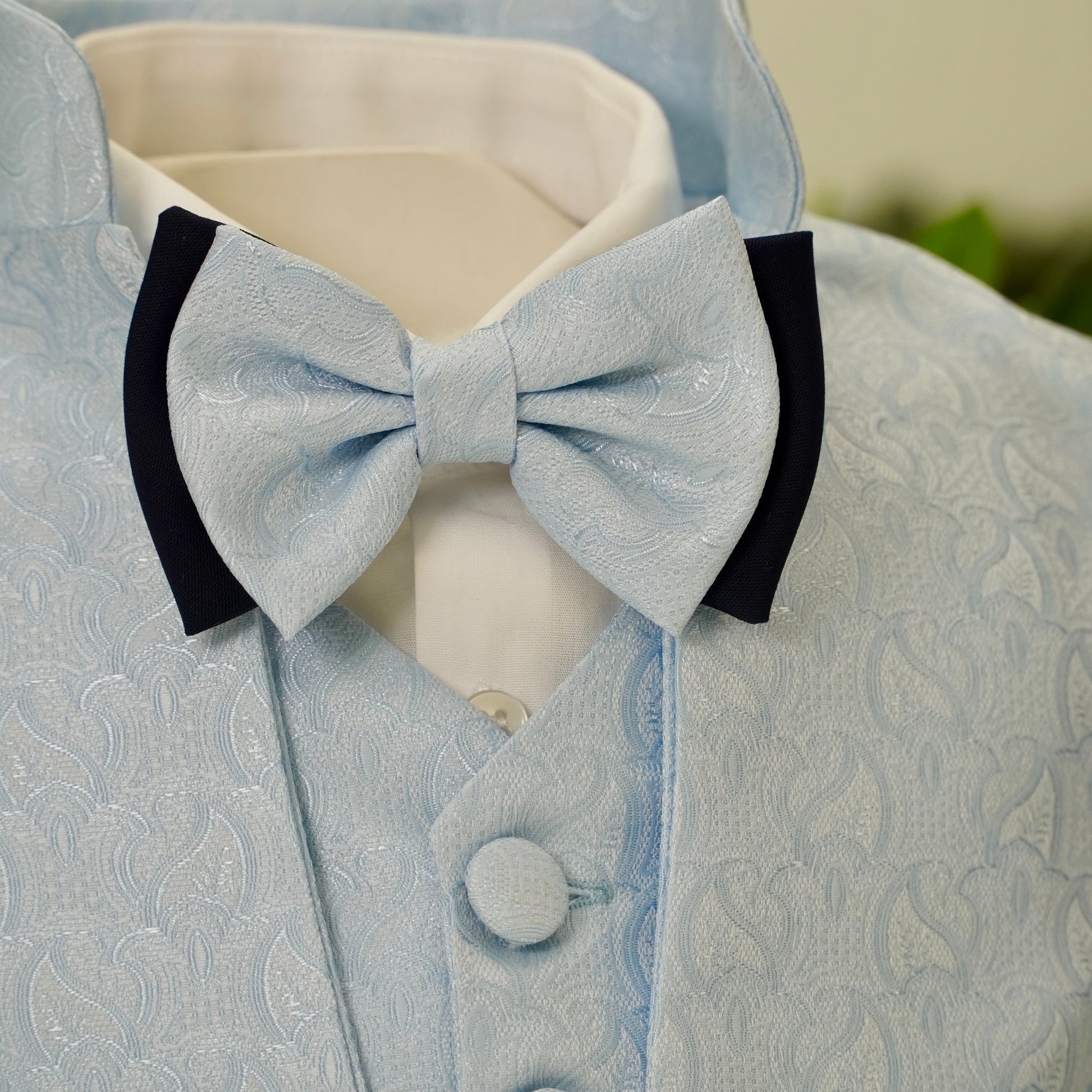 Giacca modello coreana monopetto, bottone con catenina, gilet coordinato nello stesso tessuto, pantalone modello slim in tessuto liscio, camicia bianca in cotone e papillon bicolore con gancio regolabile.