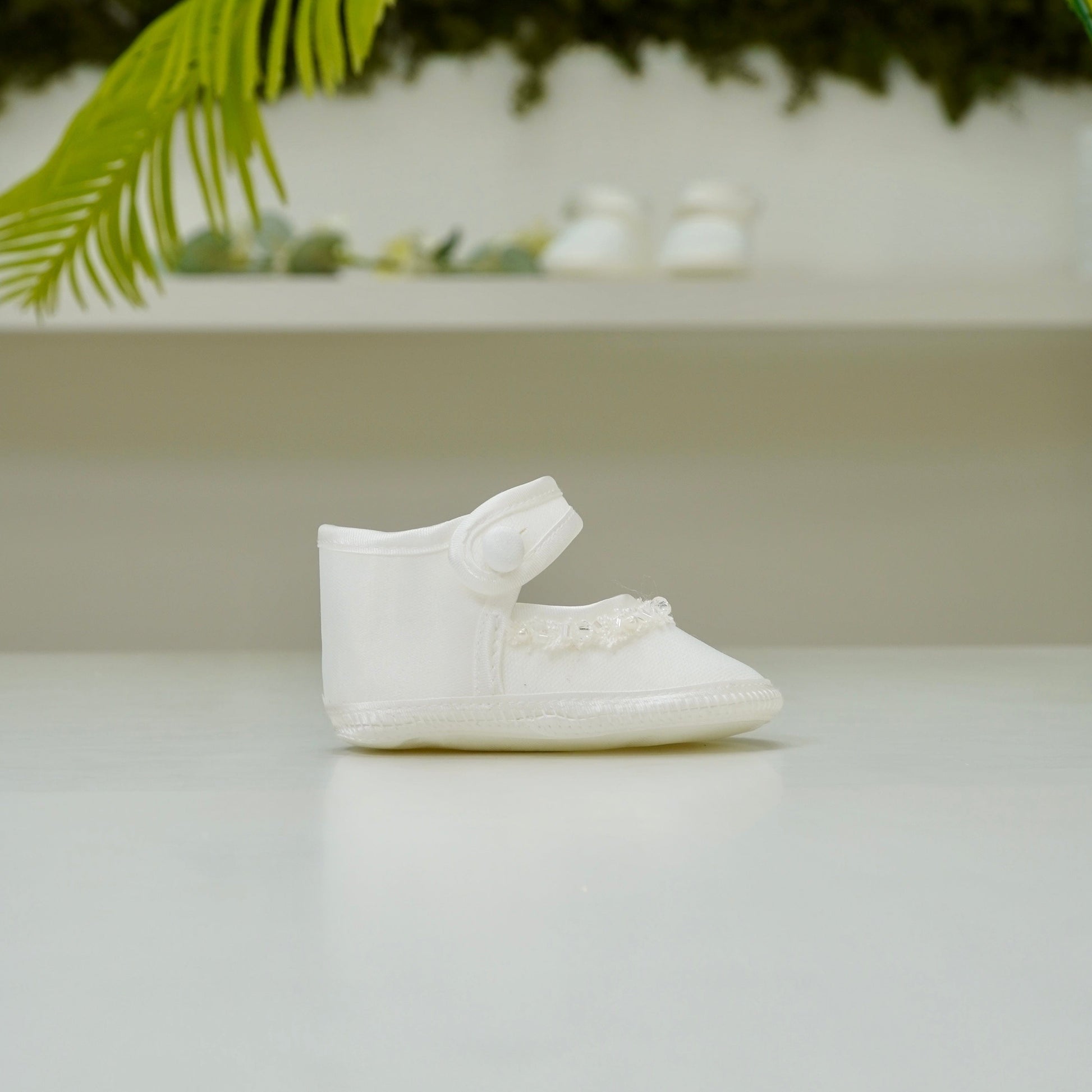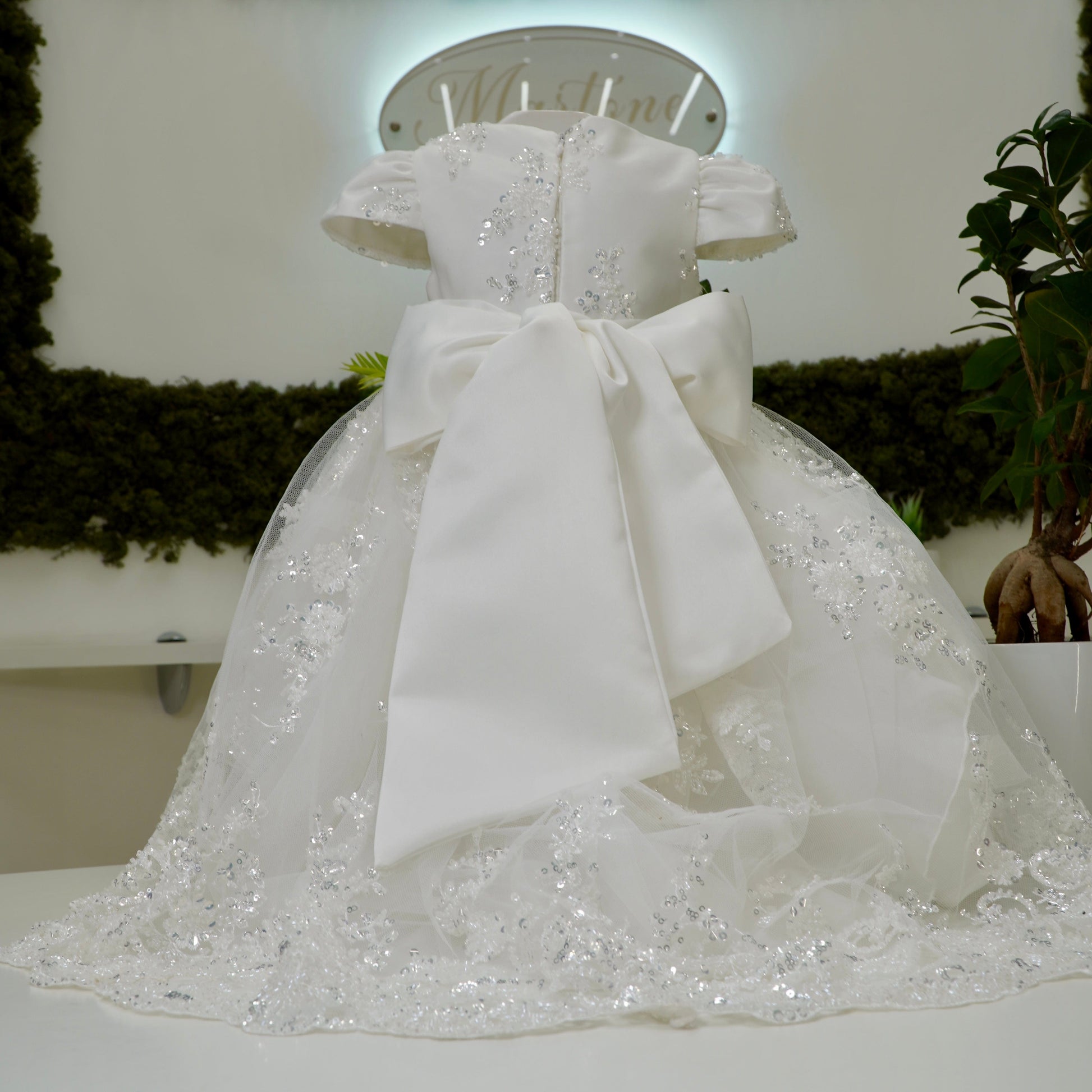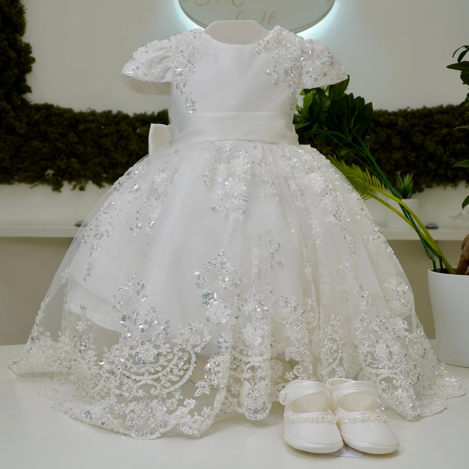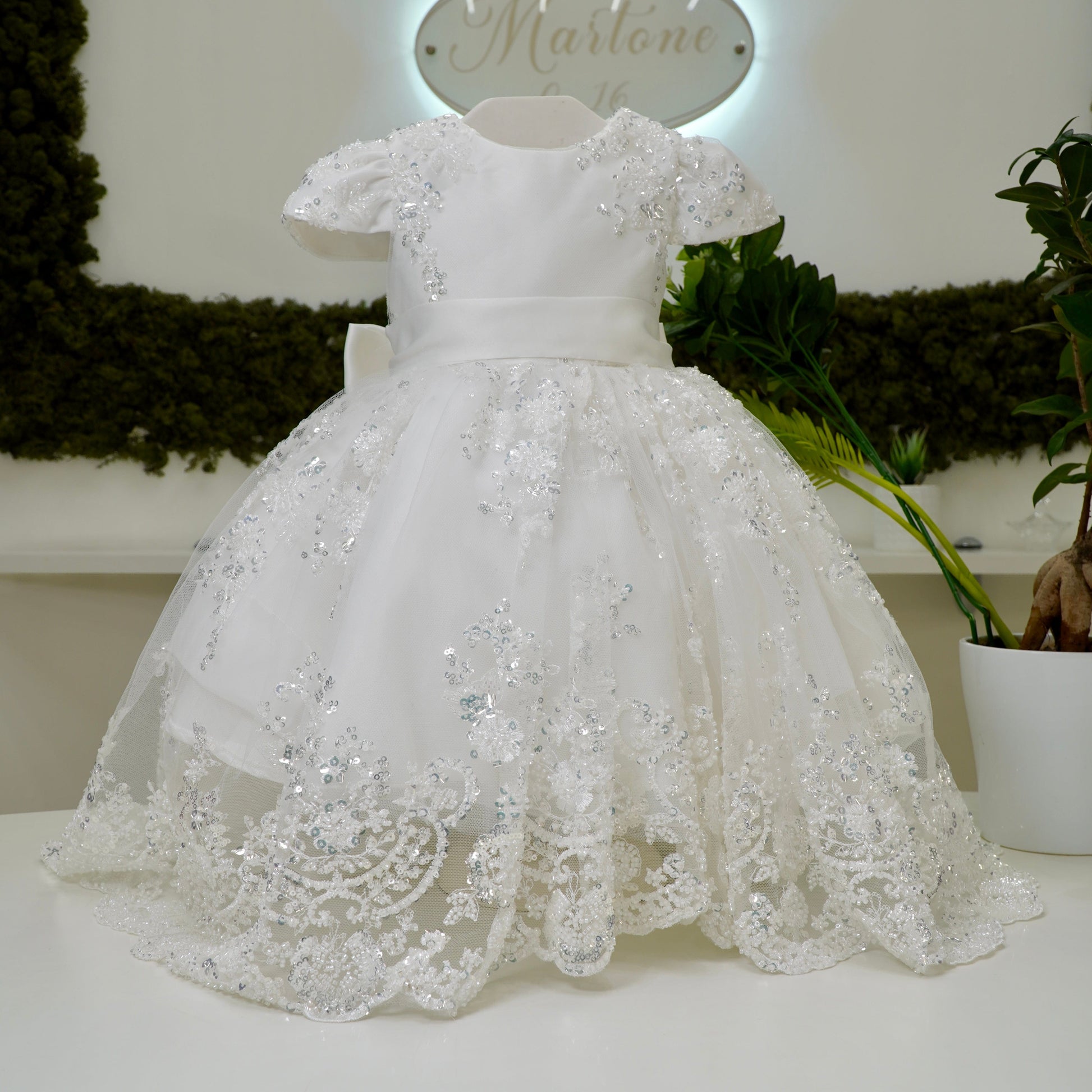 Abito battesimale regale con coda, rifinito interamente in tulle ricamato con pizzo impreziosito da punti luce e canottiglie, manica ad aletta e cintura con fiocco sul retro.