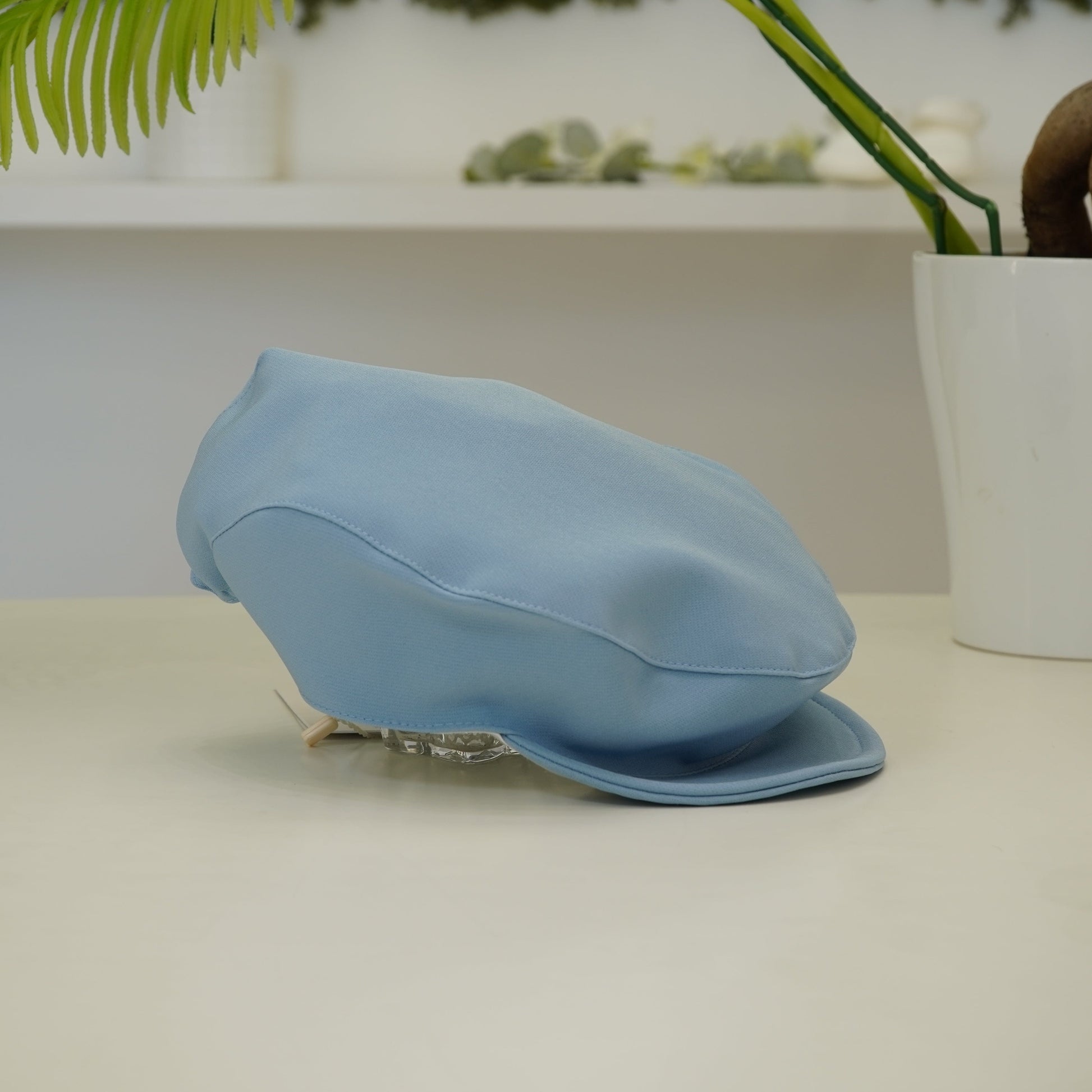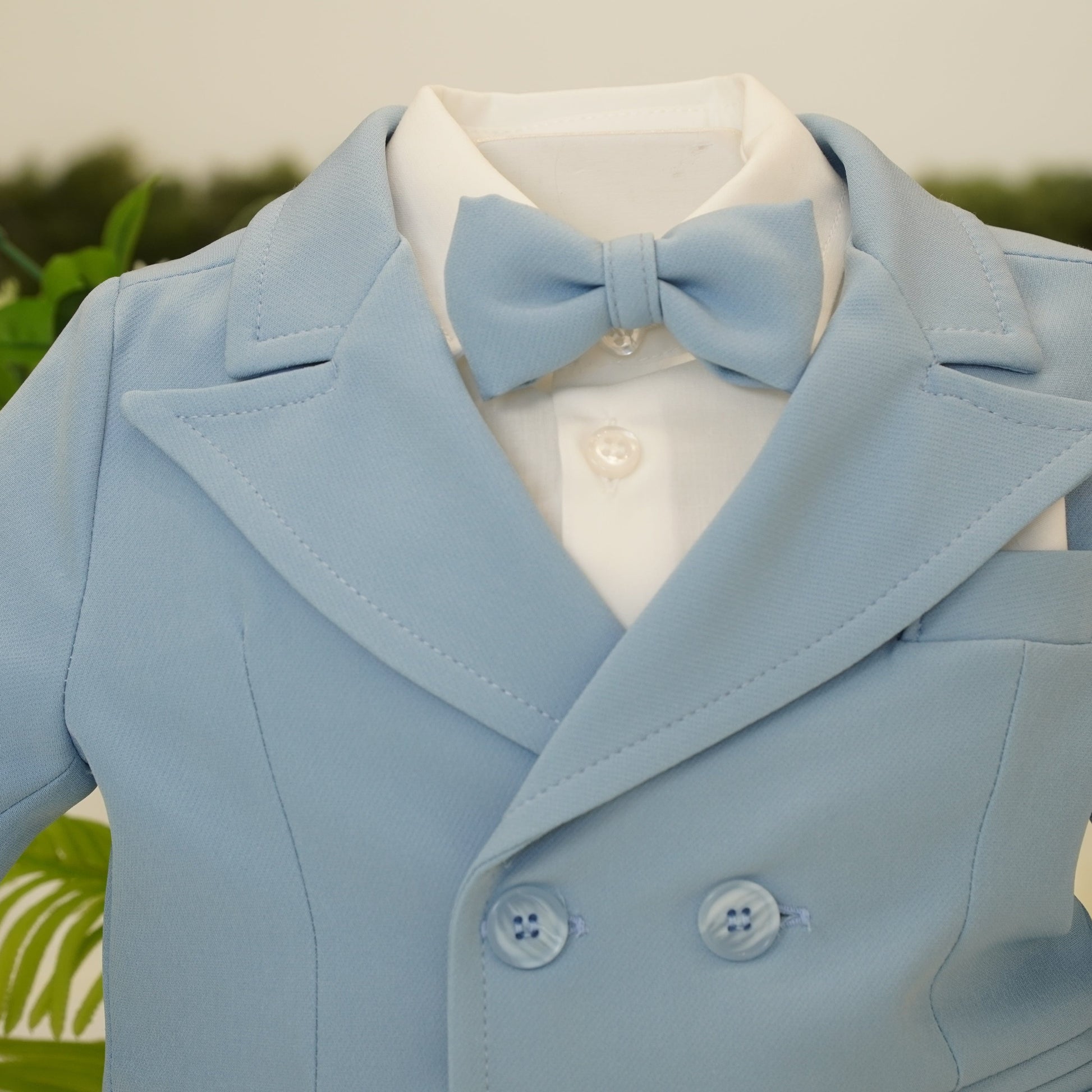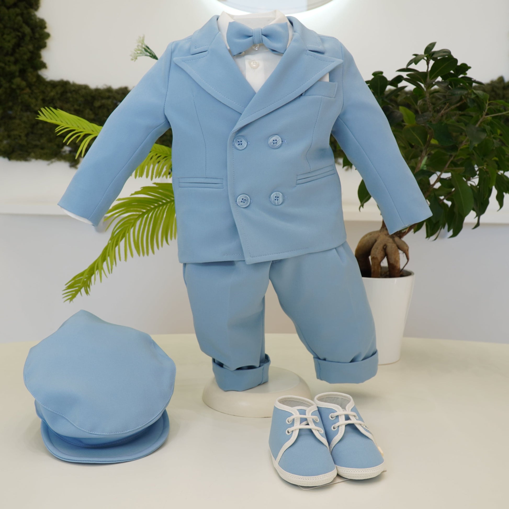 Un completo doppiopetto in celeste polvere, impeccabilmente strutturato. Rever a lancia, bottoni rivestiti, pantalone classico con risvolto sartoriale. Accessori coordinati per un look raffinato e senza tempo.