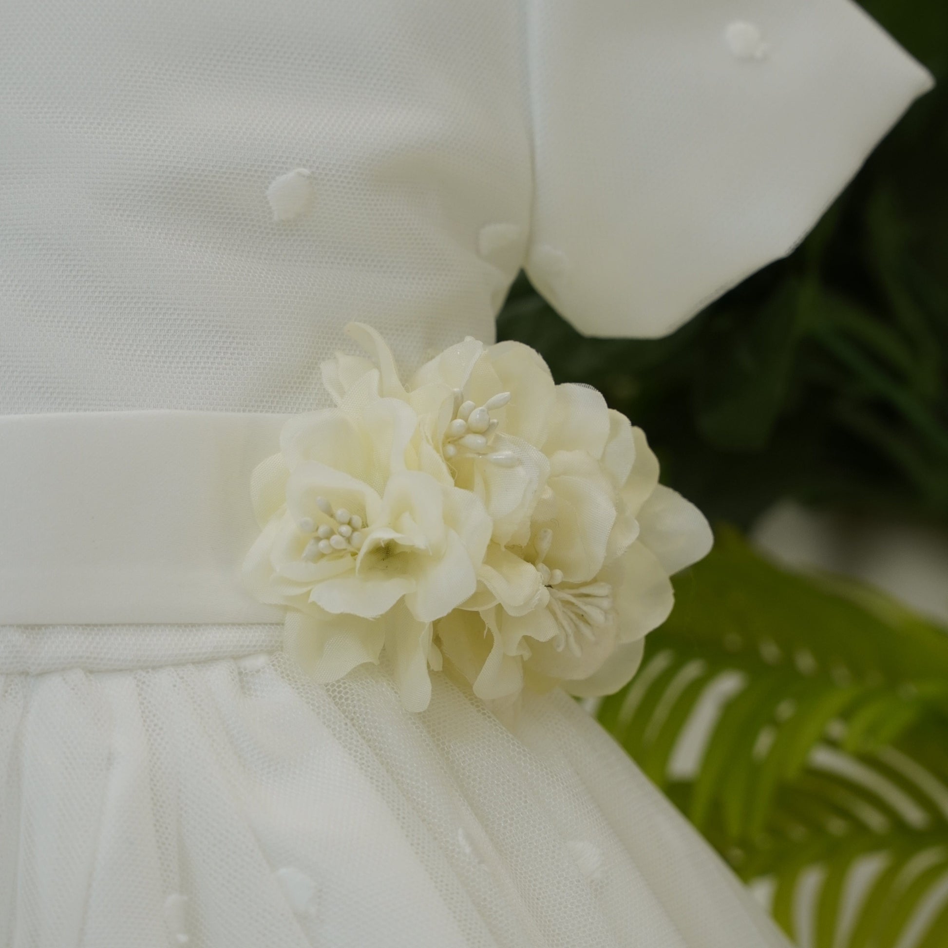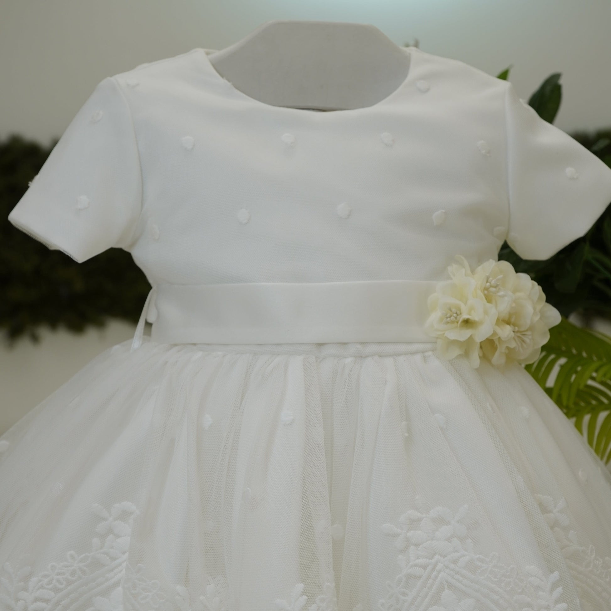 Abito da battesimo per neonata in tulle ricamato con delicato bordo in pizzo. Il corpetto in plumetis conferisce un tocco di eleganza, mentre la cintura in vita, adornata da una spilla floreale, aggiunge un dettaglio raffinato. Completato da una leggera coda, è il perfetto connubio di dolcezza e stile per un'occasione speciale.