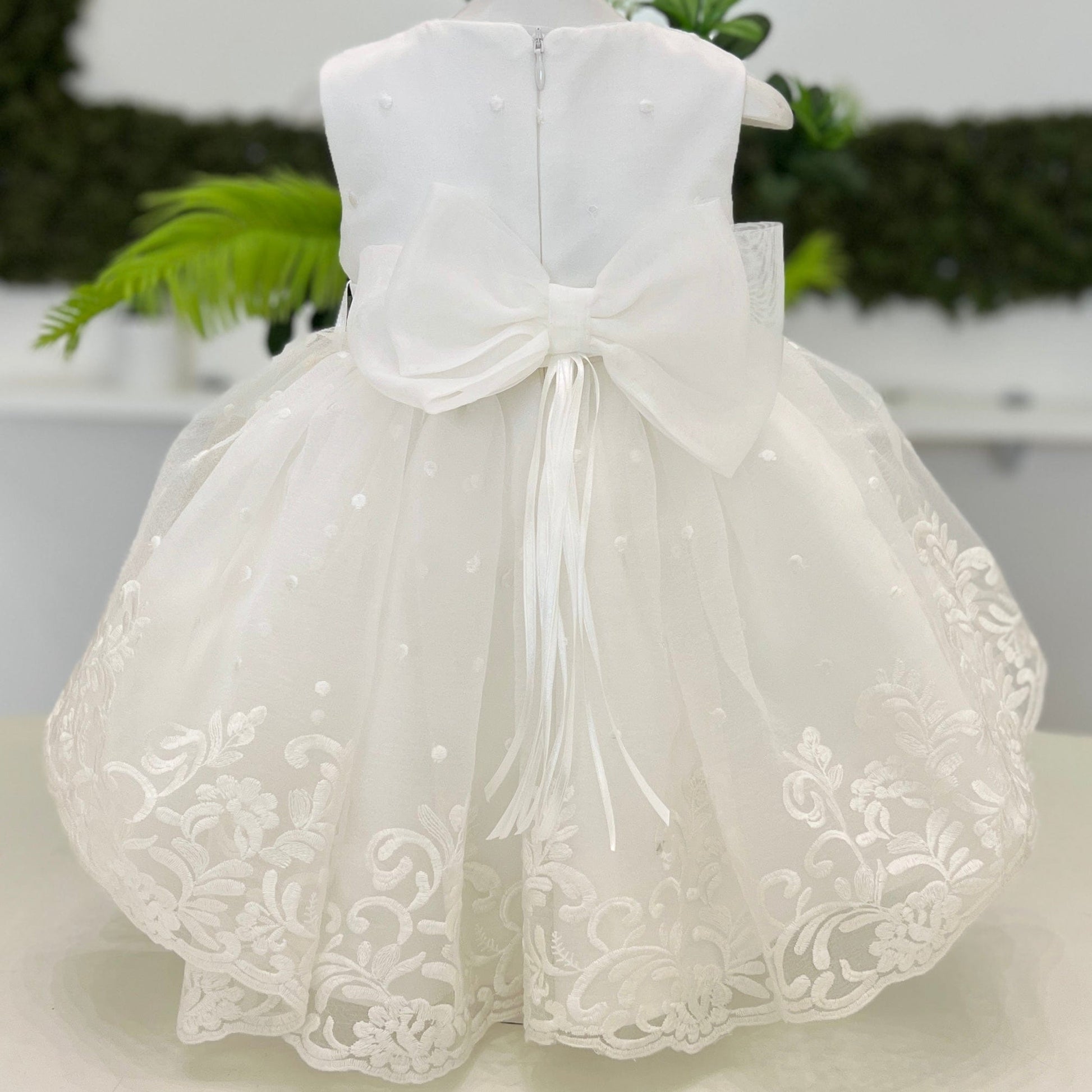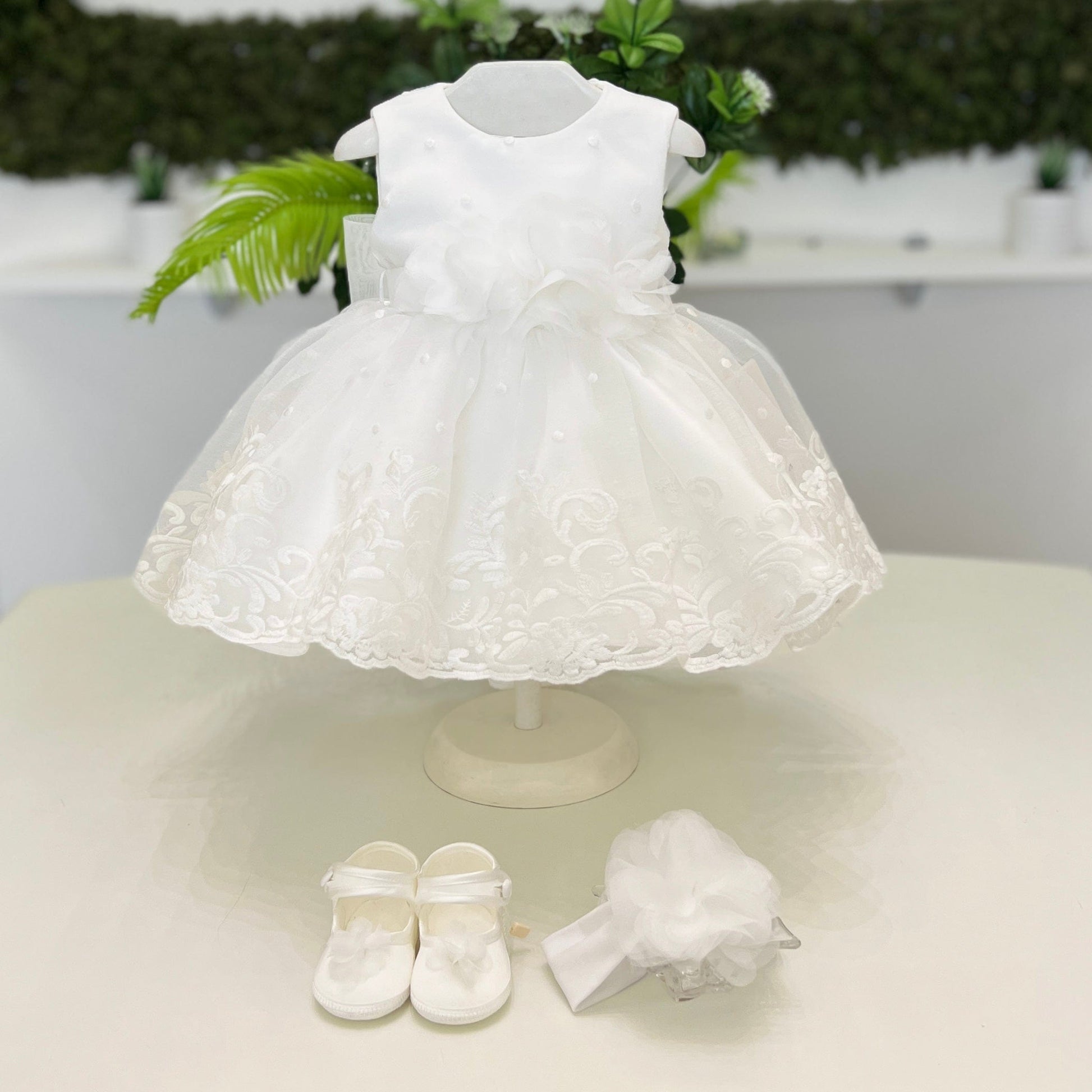 Abito in organza ricamata, caratterizzato da una coda sul retro che dona movimento e raffinatezza. La cintura floreale sottolinea il punto vita, mentre il fiocco con nastrini sul retro aggiunge un tocco di grazia e romanticismo. Una creazione perfetta per un’occasione indimenticabile.