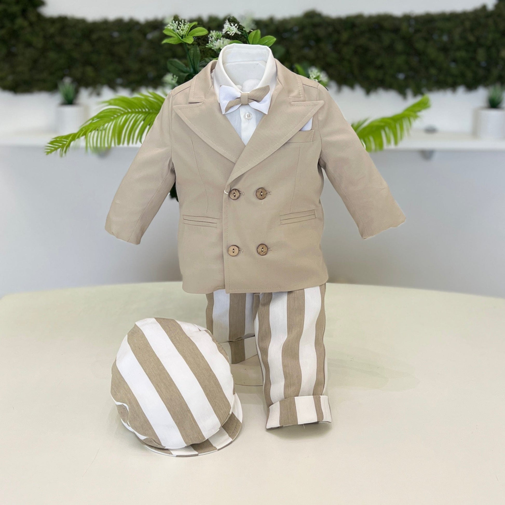 Un completo raffinato che esprime eleganza e cura nei dettagli. La giacca doppiopetto in cotone dona un tocco di classe senza tempo, mentre il pantalone a righe con risvolto aggiunge un elemento di stile sofisticato. La camicia in cotone, fresca e impeccabile, si abbina perfettamente al papillon coordinato, completando un look distintivo, ideale per un’occasione speciale.