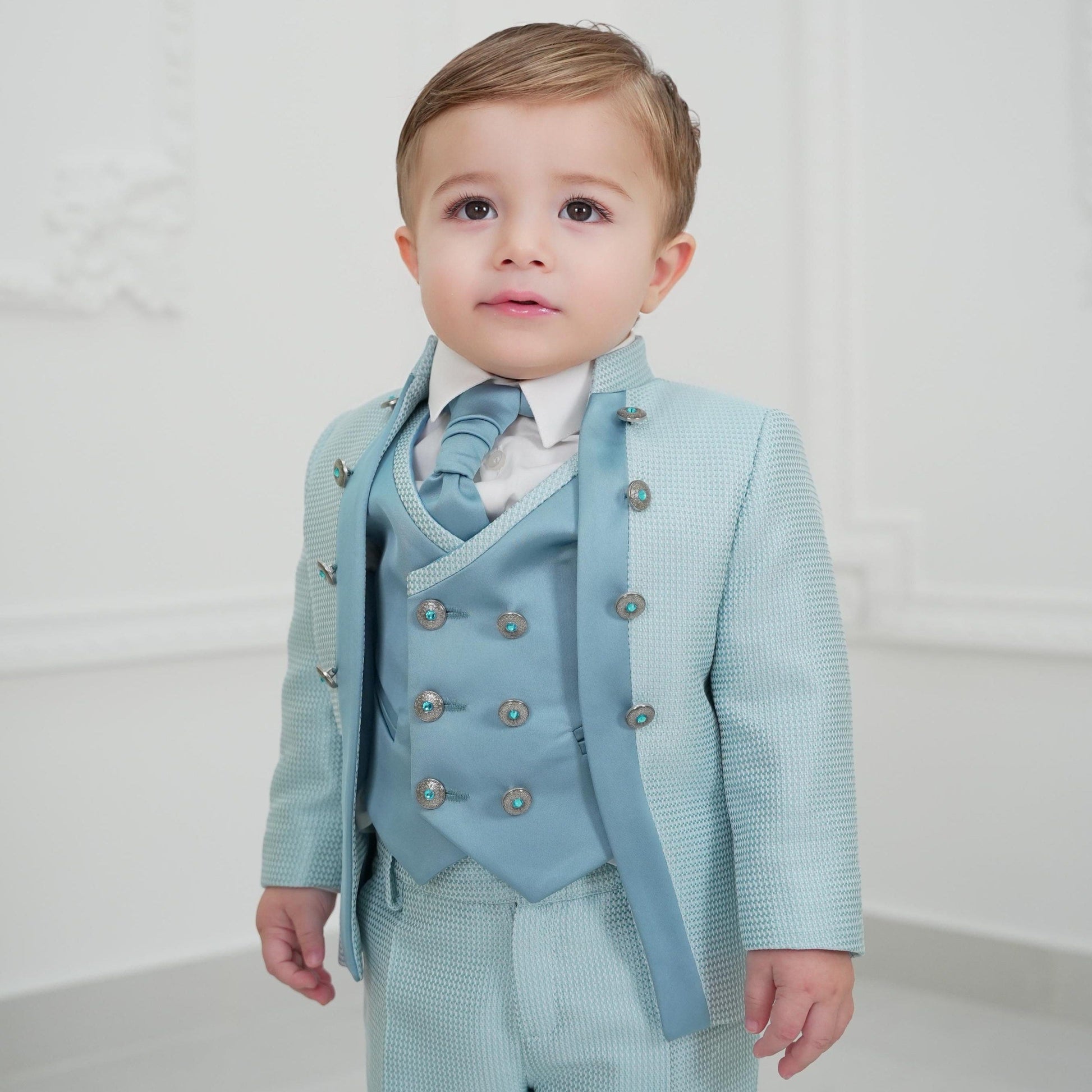 Abito battesimale sartoriale per bambino, realizzato in un’elegante tonalità di azzurro polvere. Il completo comprende giacca con rever alla coreana e bottoni gioiello, gilet doppiopetto in raso coordinato e pantalone in tessuto strutturato con finitura microtrama. Completa l’ensemble la camicia bianca con cravatta tono su tono. Un capo dal carattere raffinato e impeccabile, pensato per cerimonie in cui lo stile è protagonista assoluto